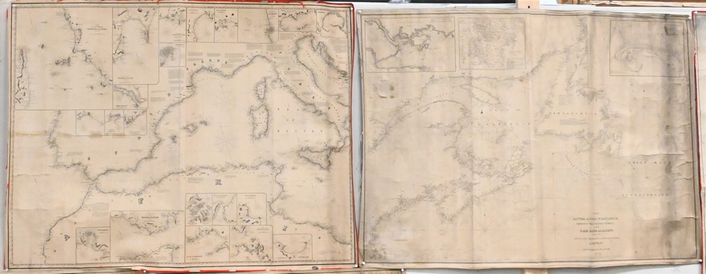 Group of Six Maps, to include James Imray & Son, Bay of Biscay; Imray & Son St. Georges Channel; James Imray’s The Bay of Honduras; E & G.W. Blunt’s The River and Gulf of St. Lawrence, Plan of Havah from the Spanish surveys; along with a large map of many mediterranean locations; largest 80″ x 41″.