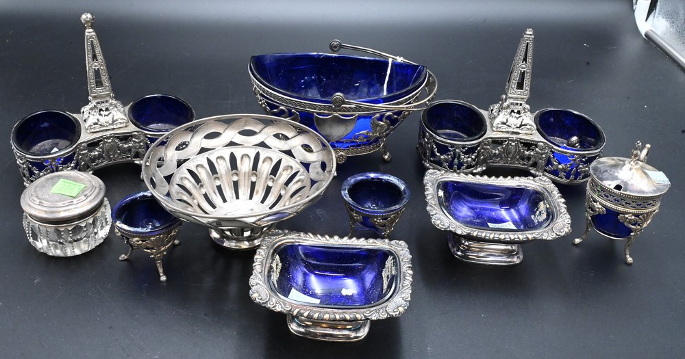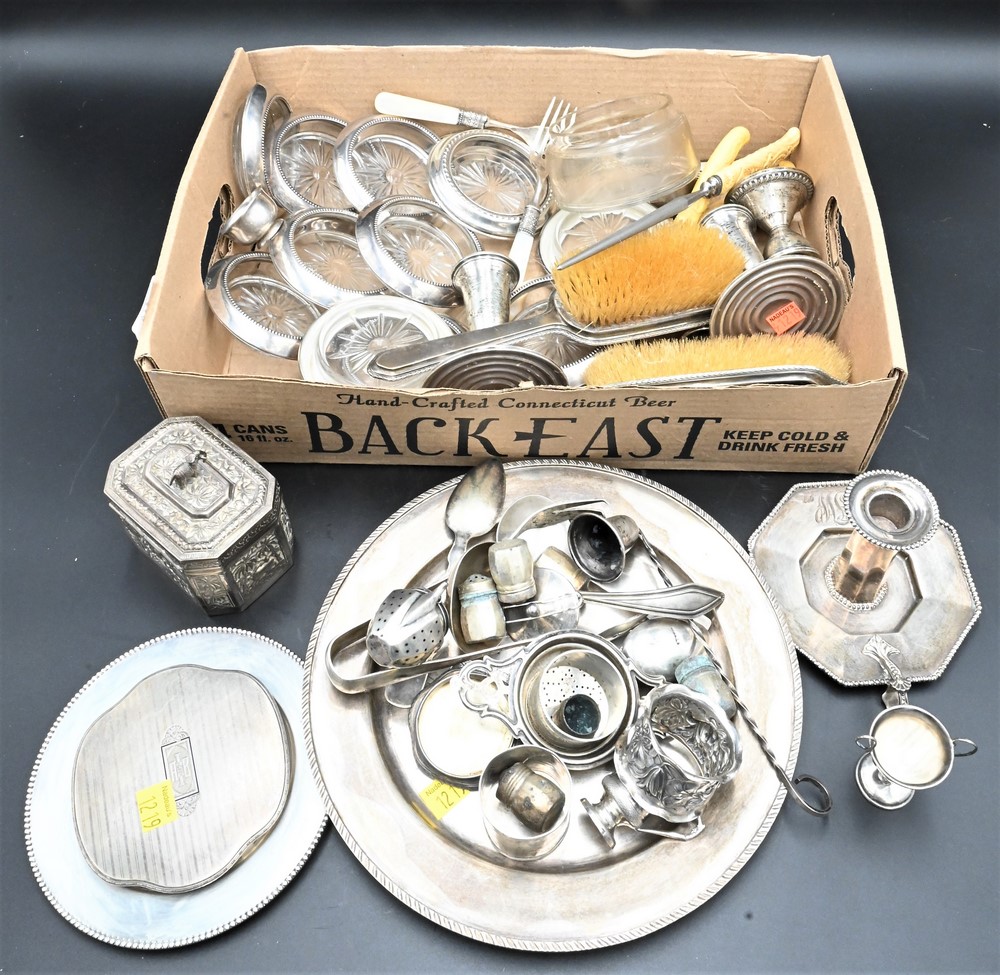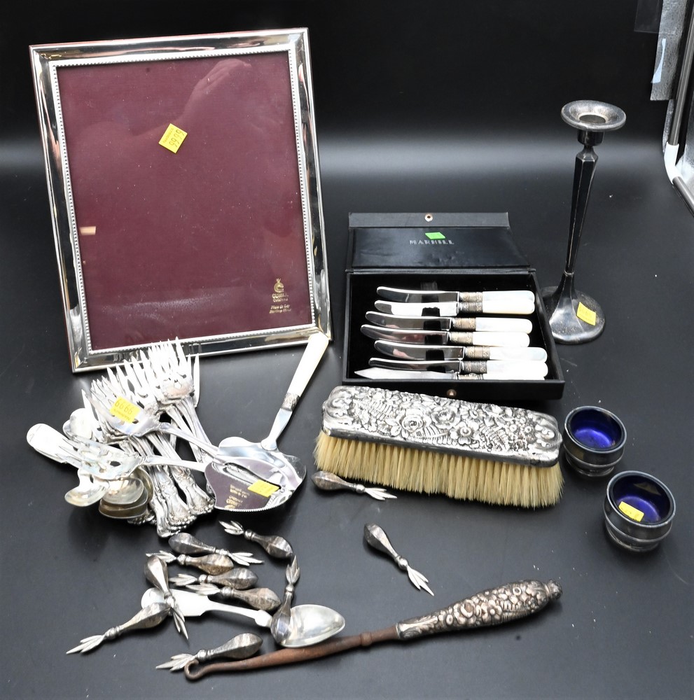 Sterling Silver Lot, to include frames, Tiffany repousse brush and button hook, set of 12 Gorham forks, coin spoons, etc., weighable 21.8 t.oz. weighable.