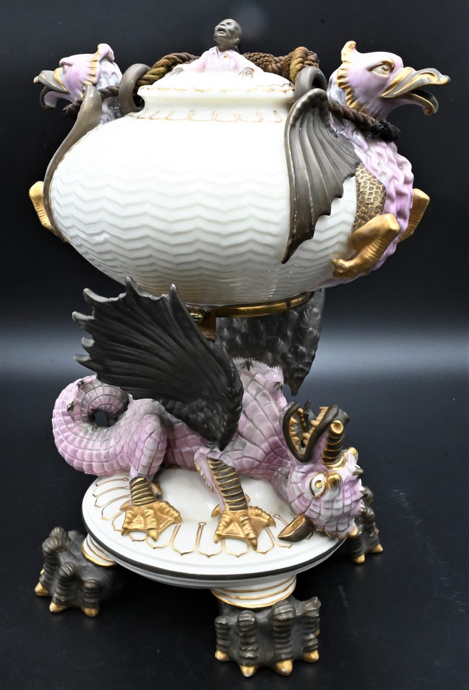 Belleek Porcelain Figural Kettle Stand, to include tilting teapot with painted phoenix bird handles resting on winged dragon form base, ending in claw feet, black mark, height 14 inches. Provenance: Collections of Norma Reilly, New Jersey.
