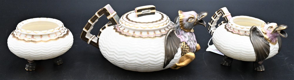 Three Piece Belleek Dragon Tea Set, to include a small teapot, creamer and sugar, all painted, height 2 1/2 inches. Provenance: Collections of Norma Reilly, New Jersey.
