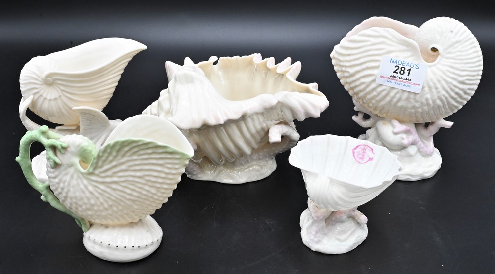 Five Belleek Shell Form Pieces, to include a conch shell on coral form base; shell on flying fish base; along with three shell form compotes; having black and pink marks; tallest vase 6 inches. Provenance: Collections of Norma Reilly, New Jersey.