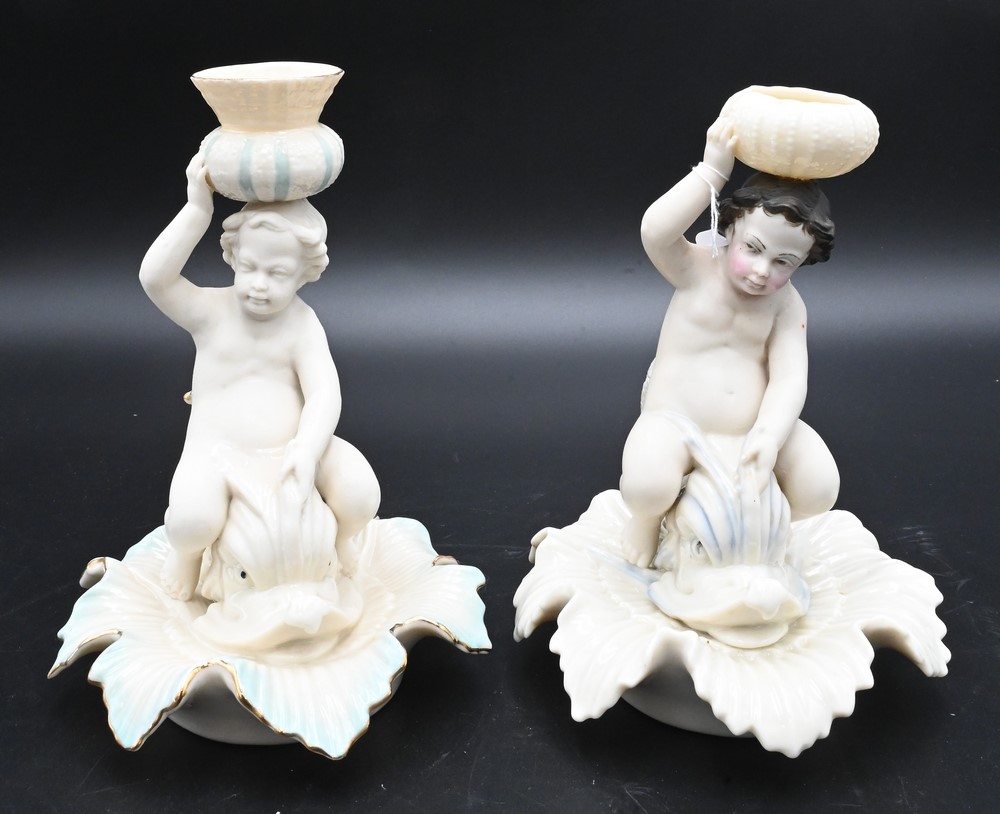 Eight Piece Belleek Group, to include two putti figural candlesticks on dolphin bases, height 7 inches; cornucopia vases; shell dishes, etc.; black and green marks; (repaired). Provenance: Collections of Norma Reilly, New Jersey.