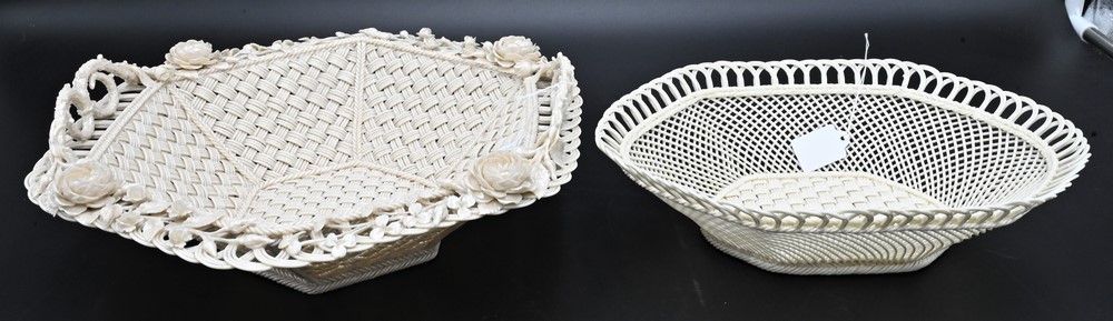 Two Belleek Baskets, four strand, one encrusted with flowers and twig handles, impressed mark on bottom, diameter 11 inches. Provenance: Collections of Norma Reilly, New Jersey.