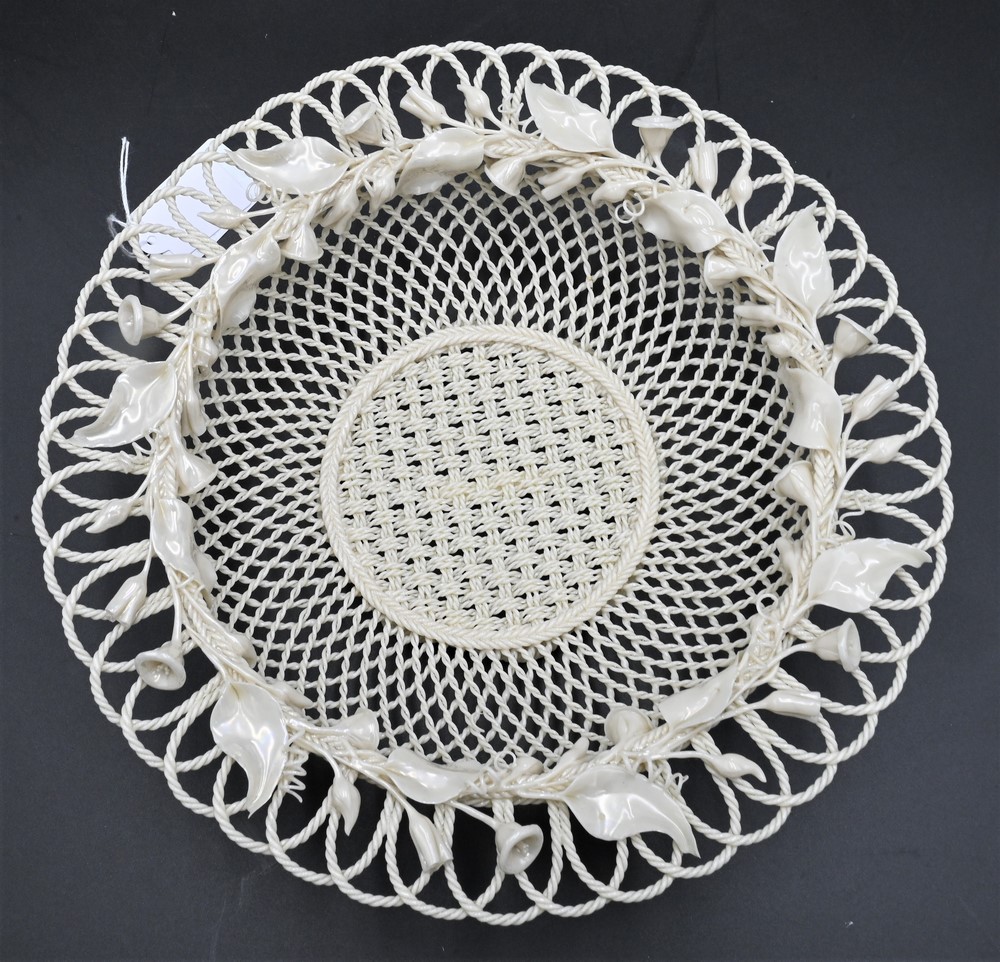 Belleek Porcelain Basket, two strand, bearing an iridescent glaze, having flowers, leaves, and vines around the rim, impressed mark on bottom, diameter 9 inches. Provenance: Collections of Norma Reilly, New Jersey.