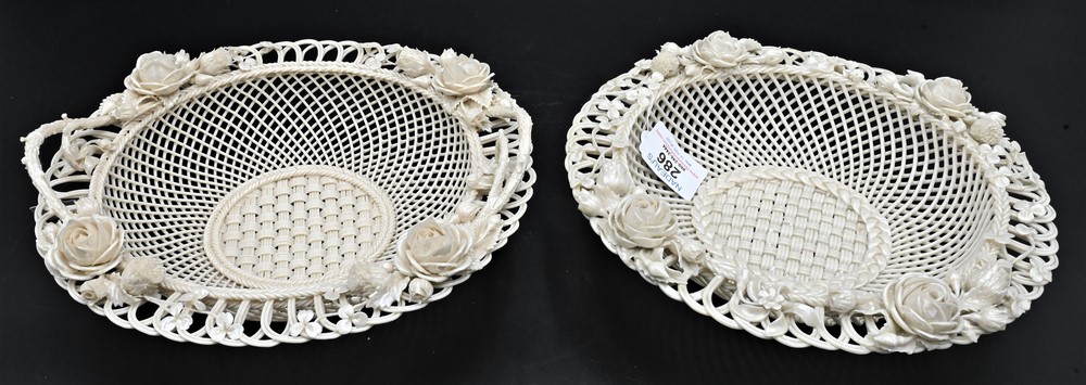 Two Round Belleek Baskets, each encrusted with flowers and one having twig handles, three strand and four strand, impressed mark on bottom, diameter 9 inches. Provenance: Collections of Norma Reilly, New Jersey.
