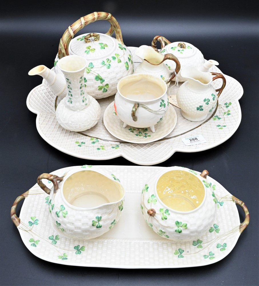 Belleek Shamrock Tea Set, to include two teapots, creamers, sugars, along with trays, having black mark. Provenance: Collections of Norma Reilly, New Jersey.
