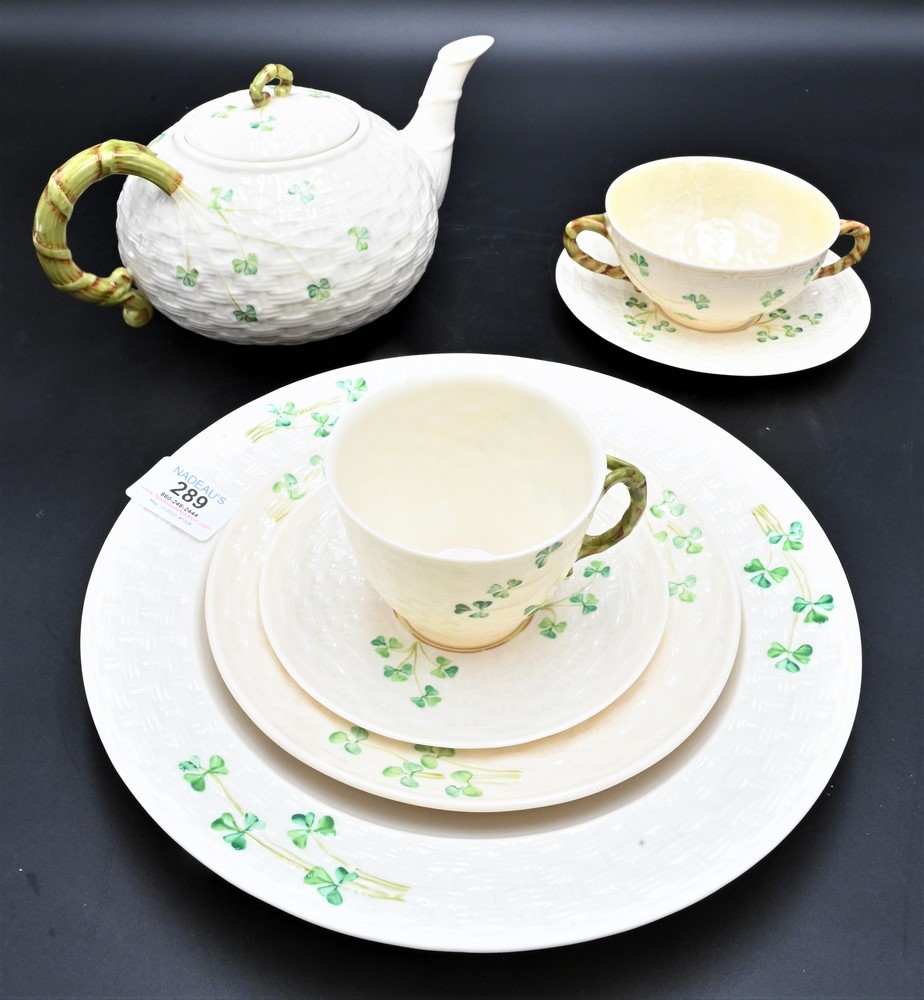 93 Piece Set of Belleek Shamrock, to include plates, cups, saucers, vases, teapots, sugars, creamers, etc., all with green mark on bottom. Provenance: Collections of Norma Reilly, New Jersey.