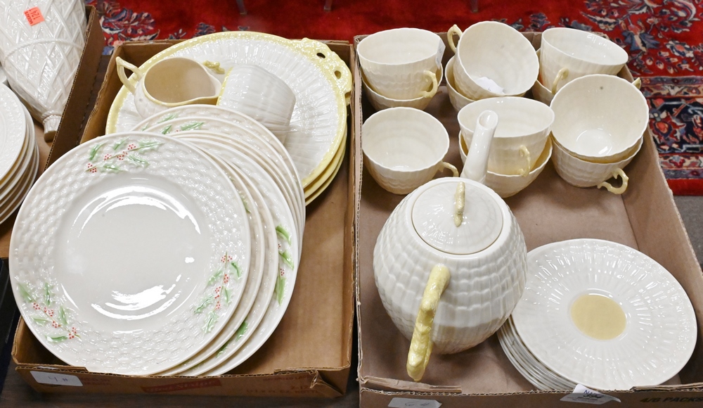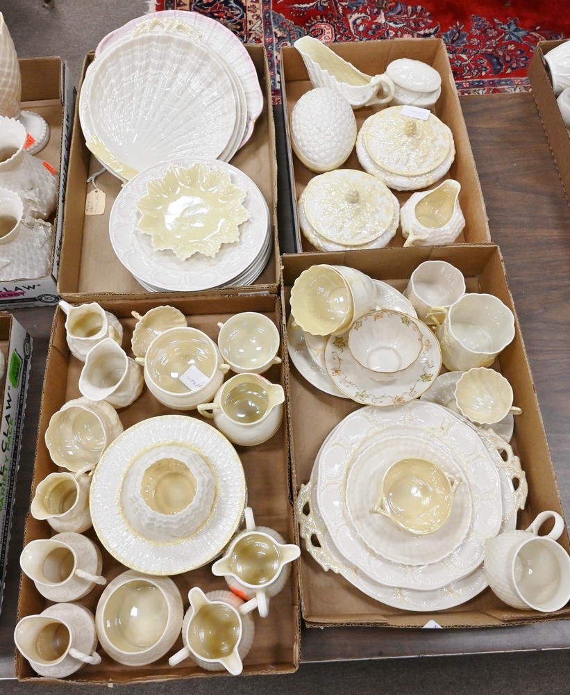 Four Tray Lots of Belleek, to include cups, saucers, plates, pitchers, creamers, sugars, covered dished, etc.; all with green marks. Provenance: Collections of Norma Reilly, New Jersey.