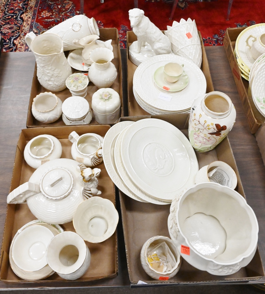 Four Tray Lots of Belleek Collectors International Society, to include thorn flower pot, wolfhound, dragon teapot set, vases, creamer, sugars, etc. Provenance: Collections of Norma Reilly, New Jersey.