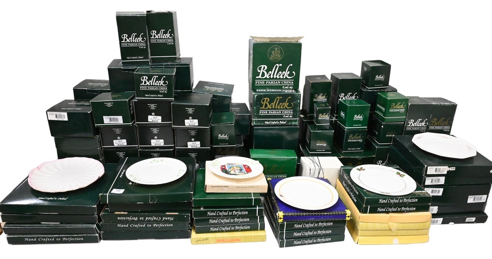 Large Group of Belleek, in original boxes, to include trays, vases, cups, teapots, Christmas plates, candlesticks, etc. Provenance: Collections of Norma Reilly, New Jersey.