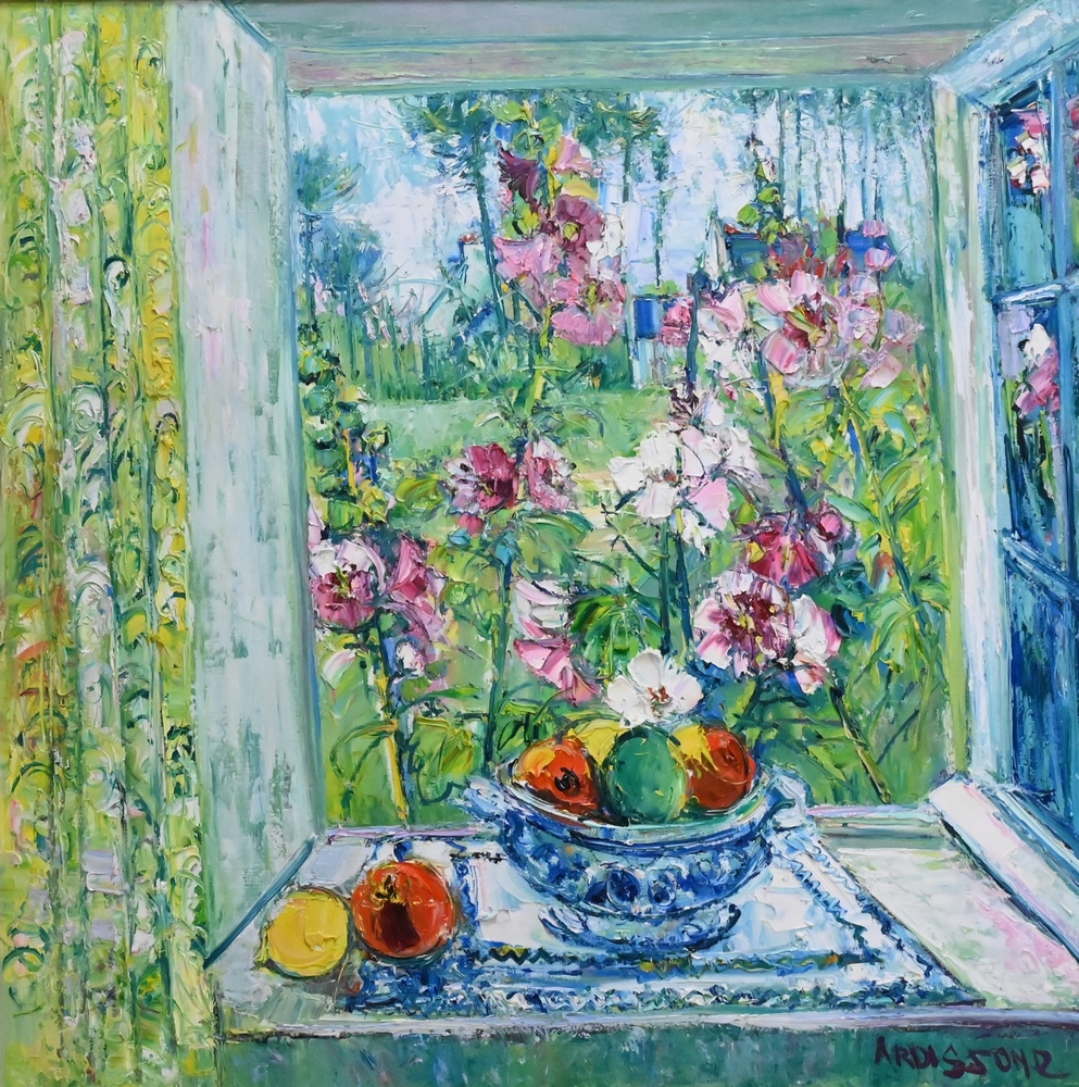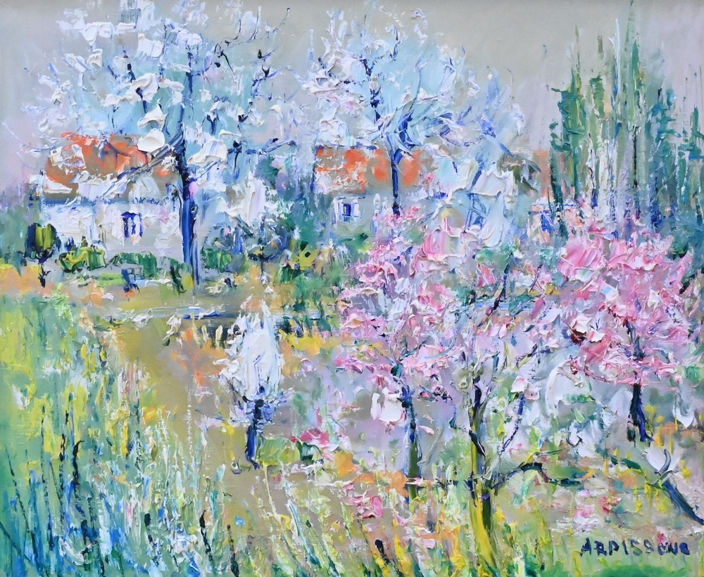 Yolande Ardissone (born 1927), landscape with flowers and trees, oil on canvas, titled “Pintemps en Loire”, signed lower right Ardissone, in gilt frame, 24″ x 21″.