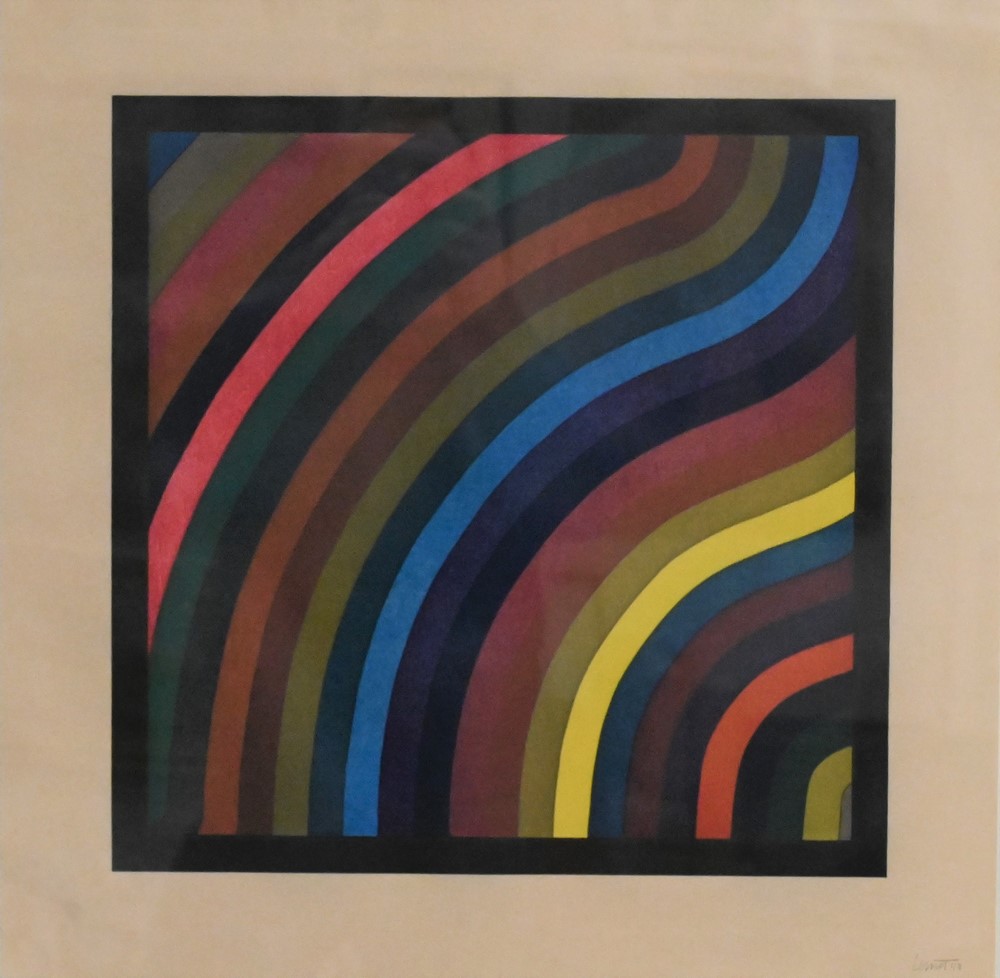 Sol LeWitt (1928 – 2007), Curved Bands, woodcut in colors, pencil numbered lower right third, pencil signed lower right LeWitt, matted in contemporary frame, paper size 22 1/2″ x 22 1/2″, image size 17 1/2″ x 17 1/2″.
