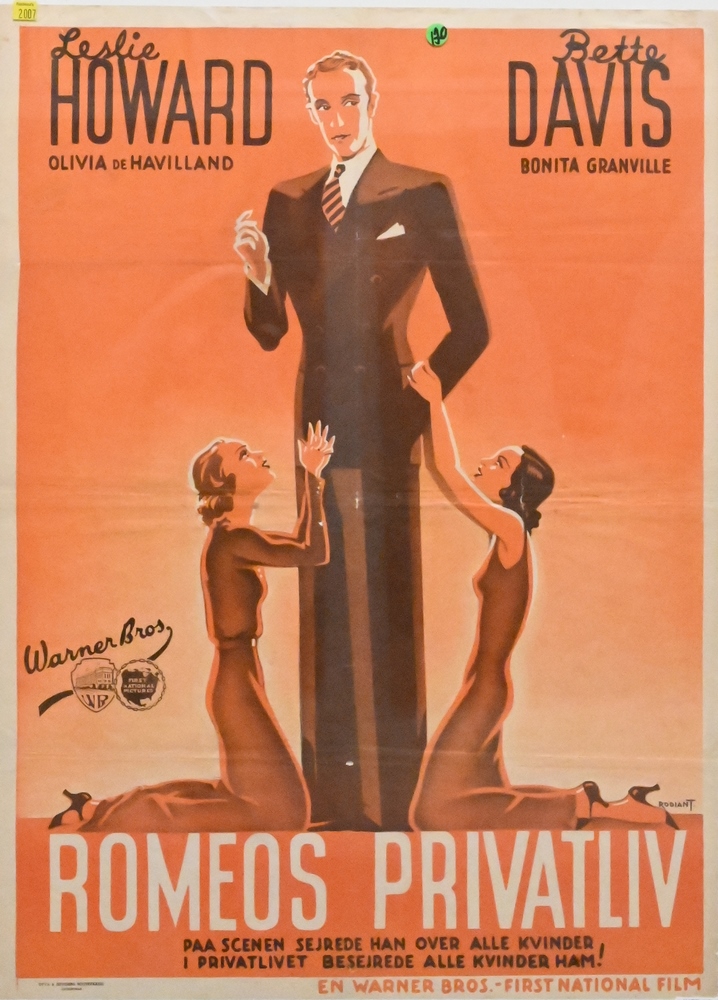 “Romeos Privatliv” Warner Brothers Movie Poster, 1941 – 1942, art by Rodiant, French version of the American movie “It’s Love I’m After” starring Leslie Howard and Bette Davis, 33 1/2″ x 24 1/2″.