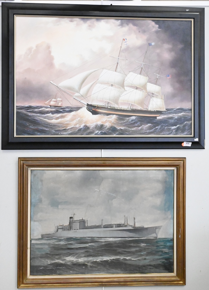 Two Piece Nautical Lot, to include two oils on canvas of ships on the ocean, one signed indistinctly lower left, the other signed J. Glogier lower left, 24″ x 36″; 22″ x 31″.