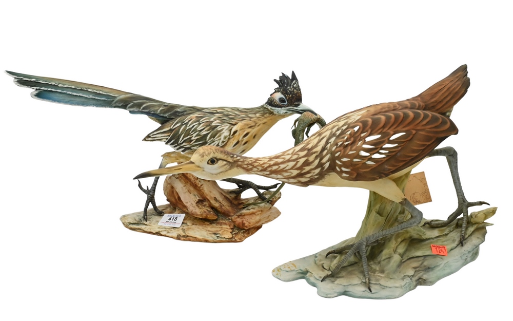 Two Giuseppe Tagliariol Tay Porcelain Road Runners Figures, by Giuseppe Tagliariol, limited edition, both signed and editioned; height 10 inches, length 19 1/2 inches; along with one height 10 inches, length 18 inches. Provenance: Collections of Norma Reilly, New Jersey.