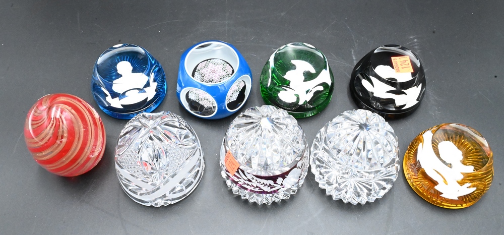 Group of Nine Glass Paperweights, to include four Baccarat silhouette, one St. Louis millefiori, along with four others; tallest 4 inches, largest diameter 2 1/2 inches. Provenance: Collections of Norma Reilly, New Jersey.