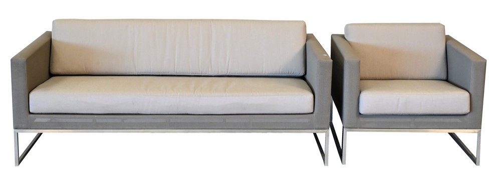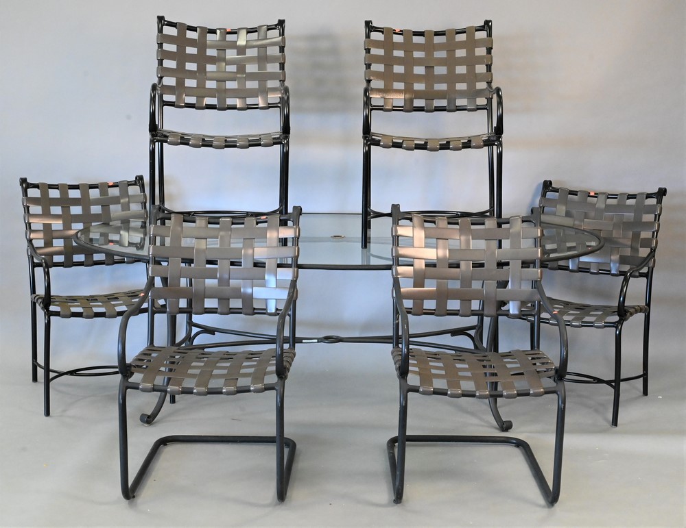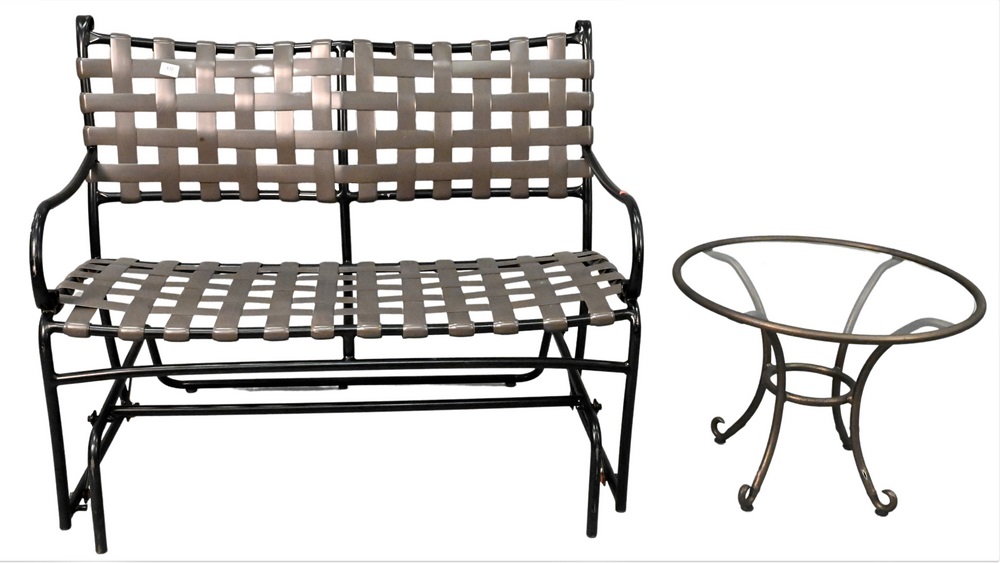 Brown & Jordan Six Piece Outdoor Set, to include two loungers, glider, tea cart (one glass missing), footstool, along with a small round glass top table.
