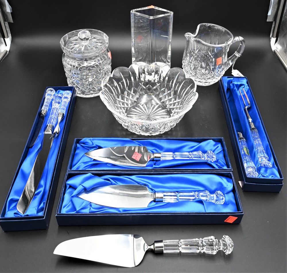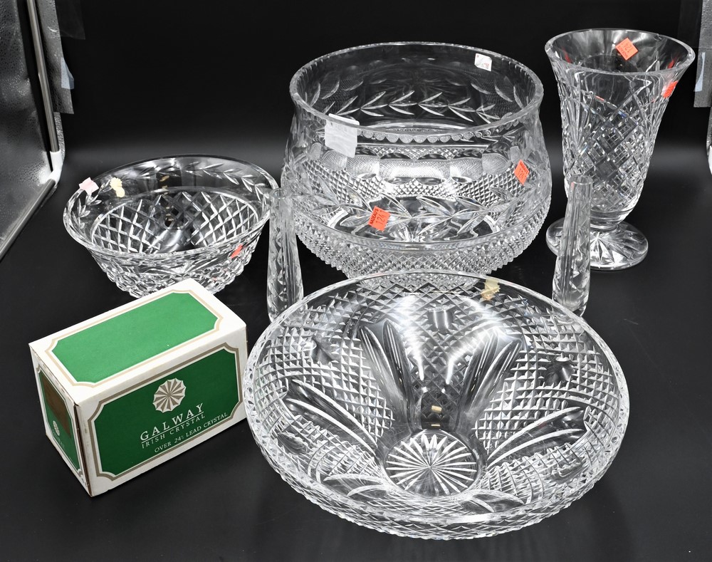 Large Group of Glass, to include Waterford bowls, vases, Galway punch bowl, and glasses in boxes; bowl diameter 10 1/2 inches, vase 7 inches. Provenance: Collections of Norma Reilly, New Jersey.