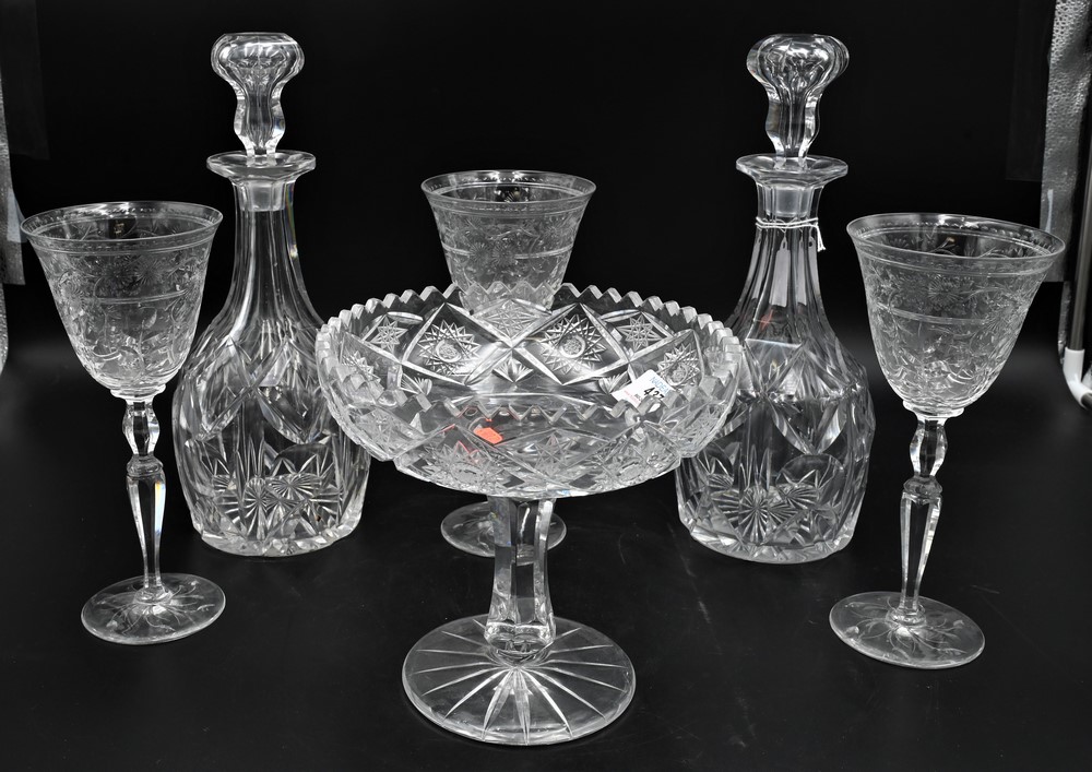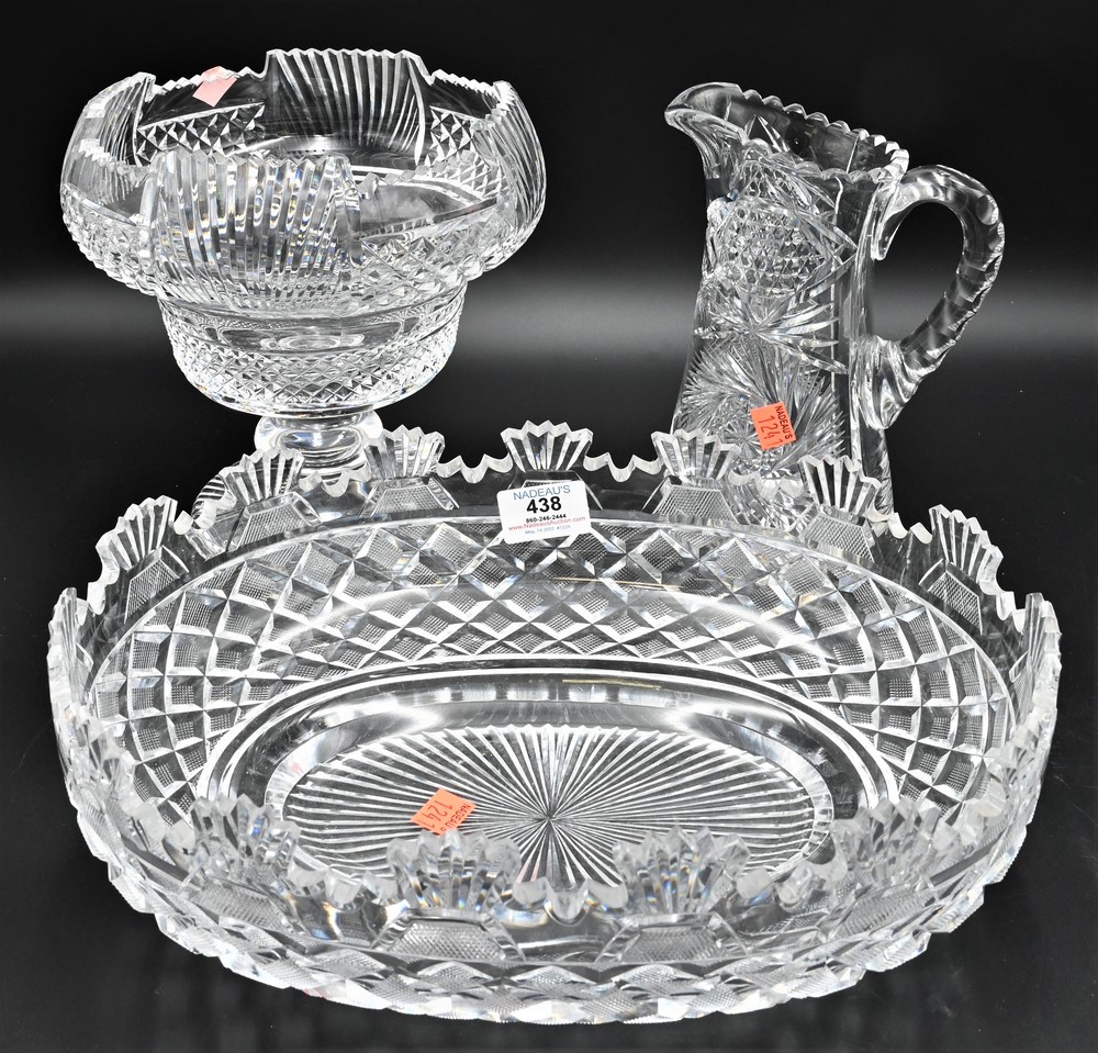 Three Cut Glass Pieces, to include a large compote, height 8 1/2 inches; large oval bowl length 13 1/2 inches; along with a pitcher. Provenance: Collections of Norma Reilly, New Jersey.