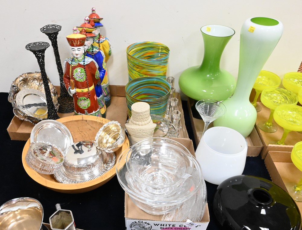 Large Group of Assorted Items, to include Tozai art glass vases, Tiffany & Company glass candlesticks, glass bowls, ceramic asian figures, wood bowl, pair of candle prickets, alogn with silverplate.