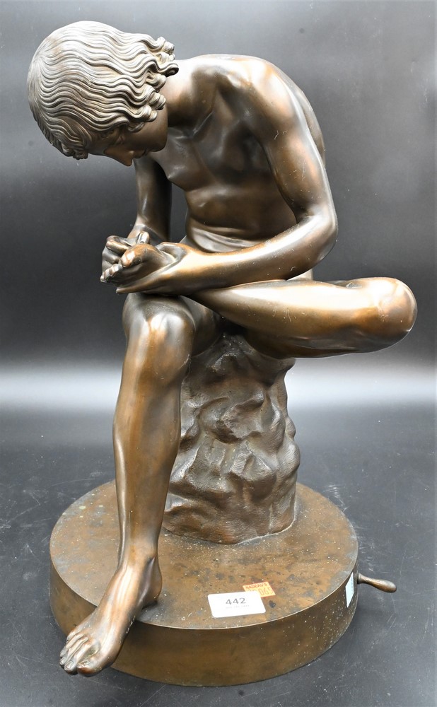 Patinated Bronze Figure of Spinario, after the antique cast by A. Rohrich, Roma, 19th century, height 19 1/4 inches, (rubbing and spotting to patina). Provenance: An estate from Redding, CT.