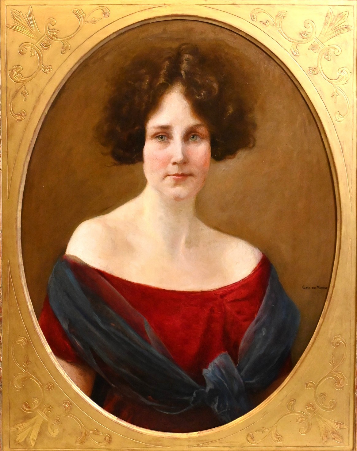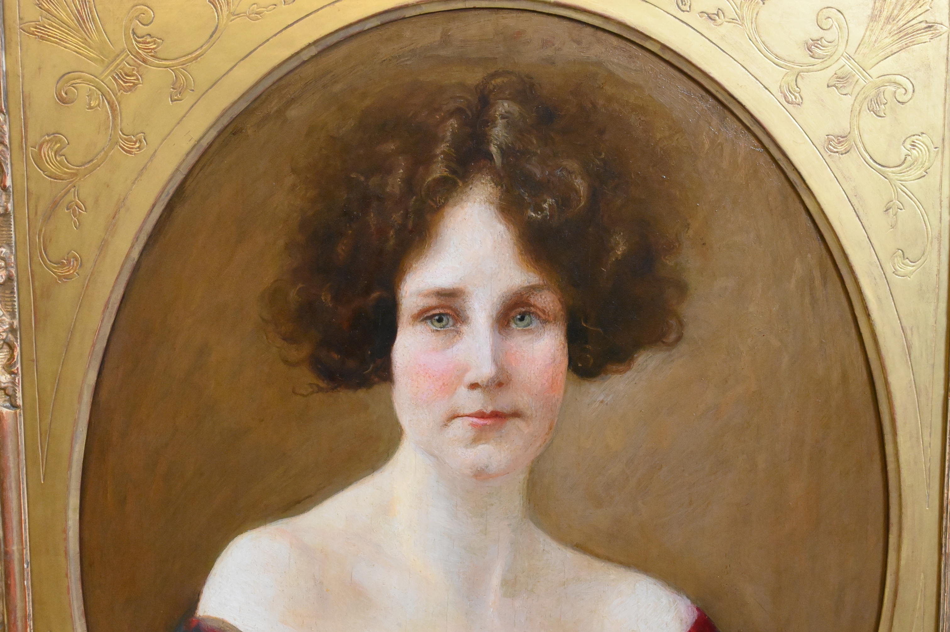 Portrait of a woman with green eyes and brown hair, in a red dress and shawl