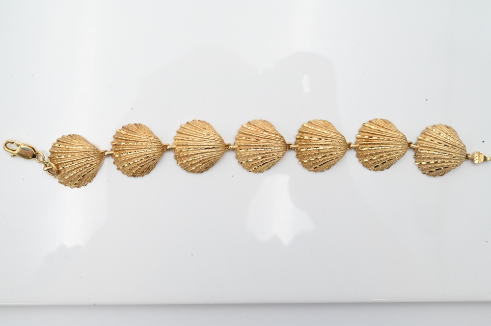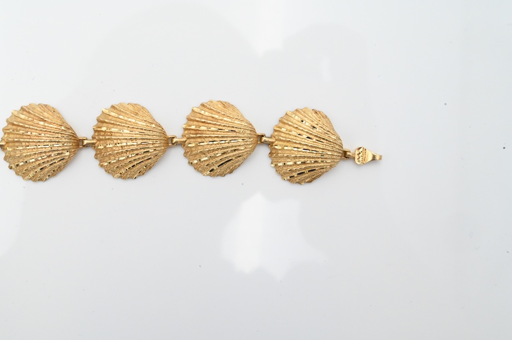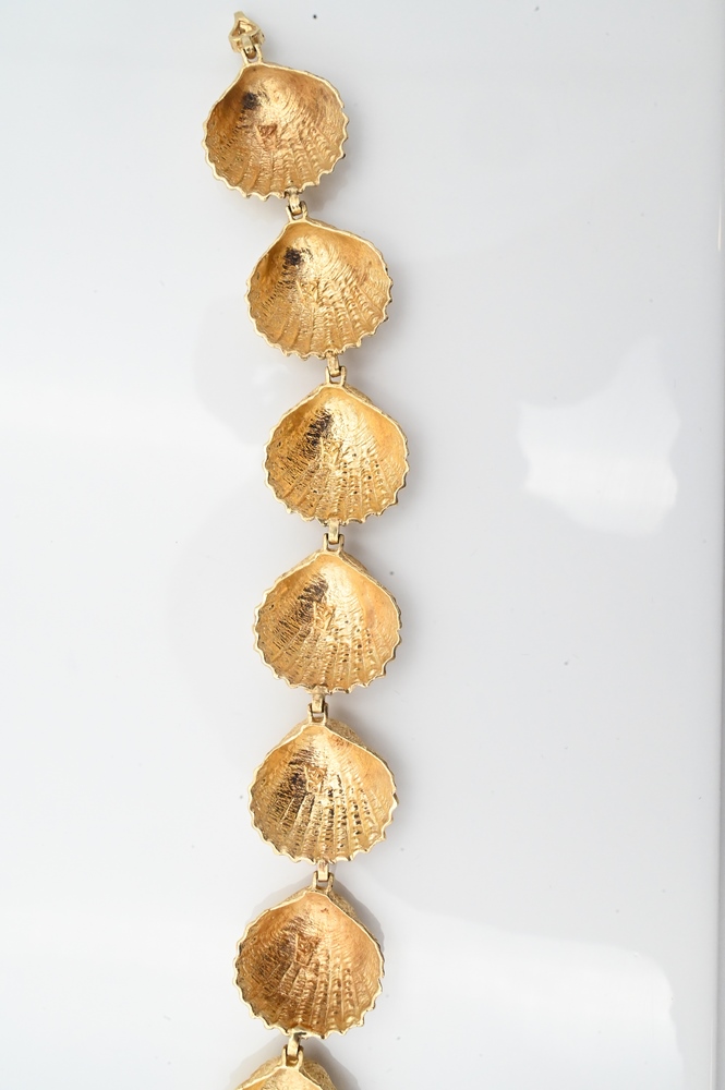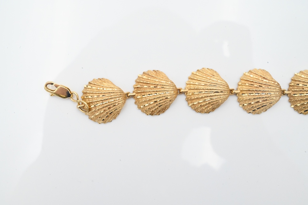 14 Karat Gold Shell Bracelet, having seven shell forms, marked 14K, 24.3 grams.