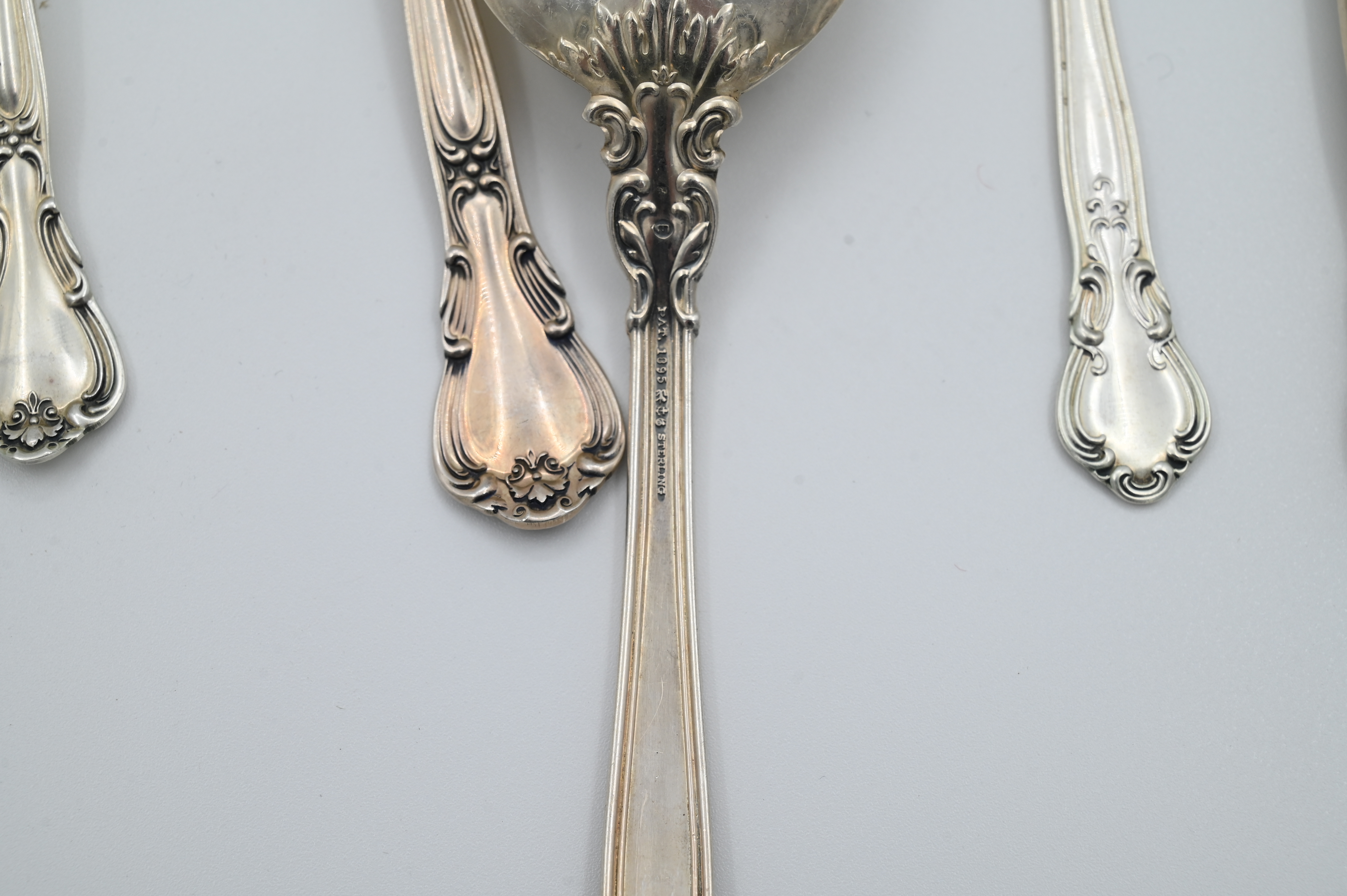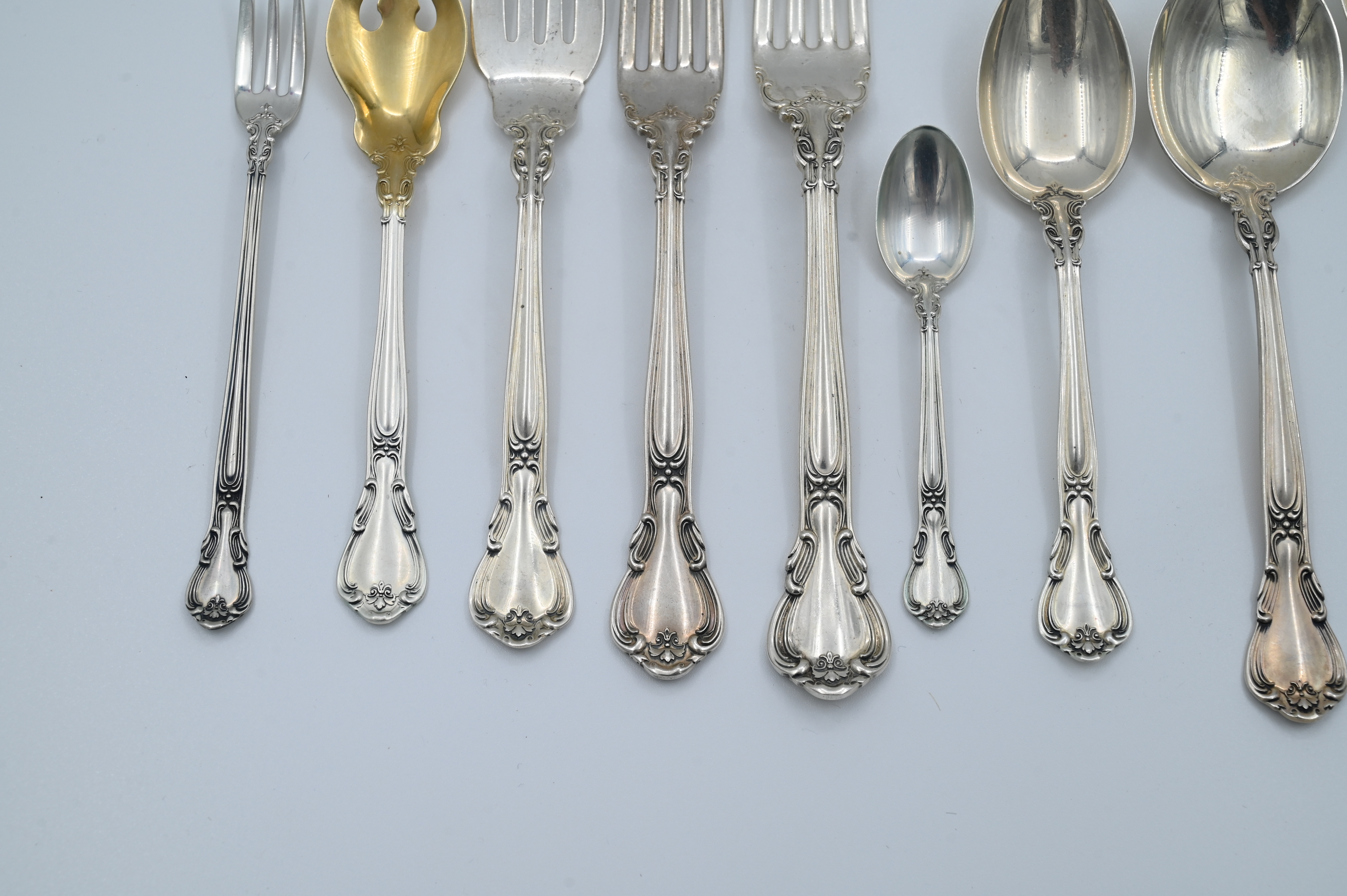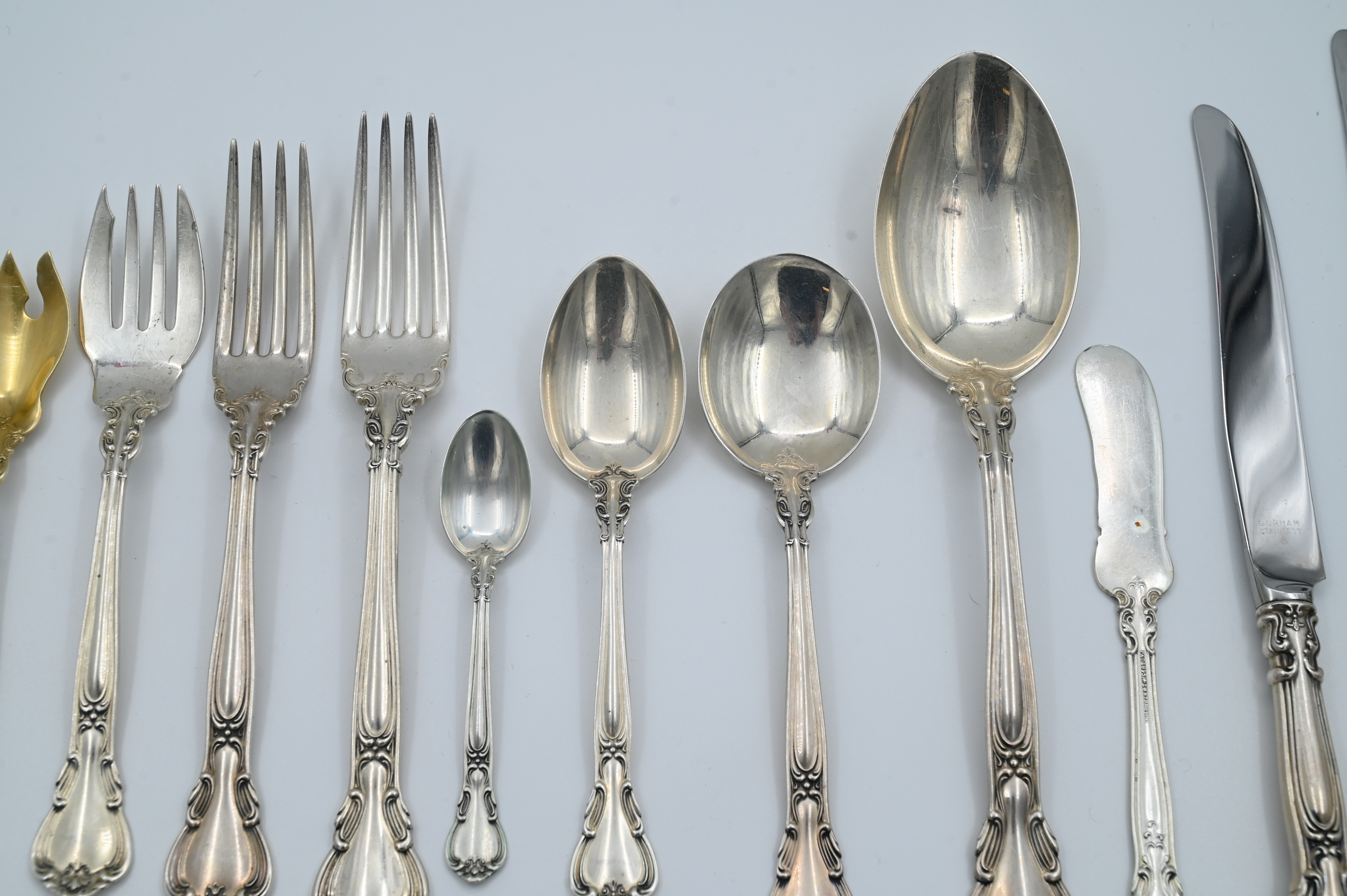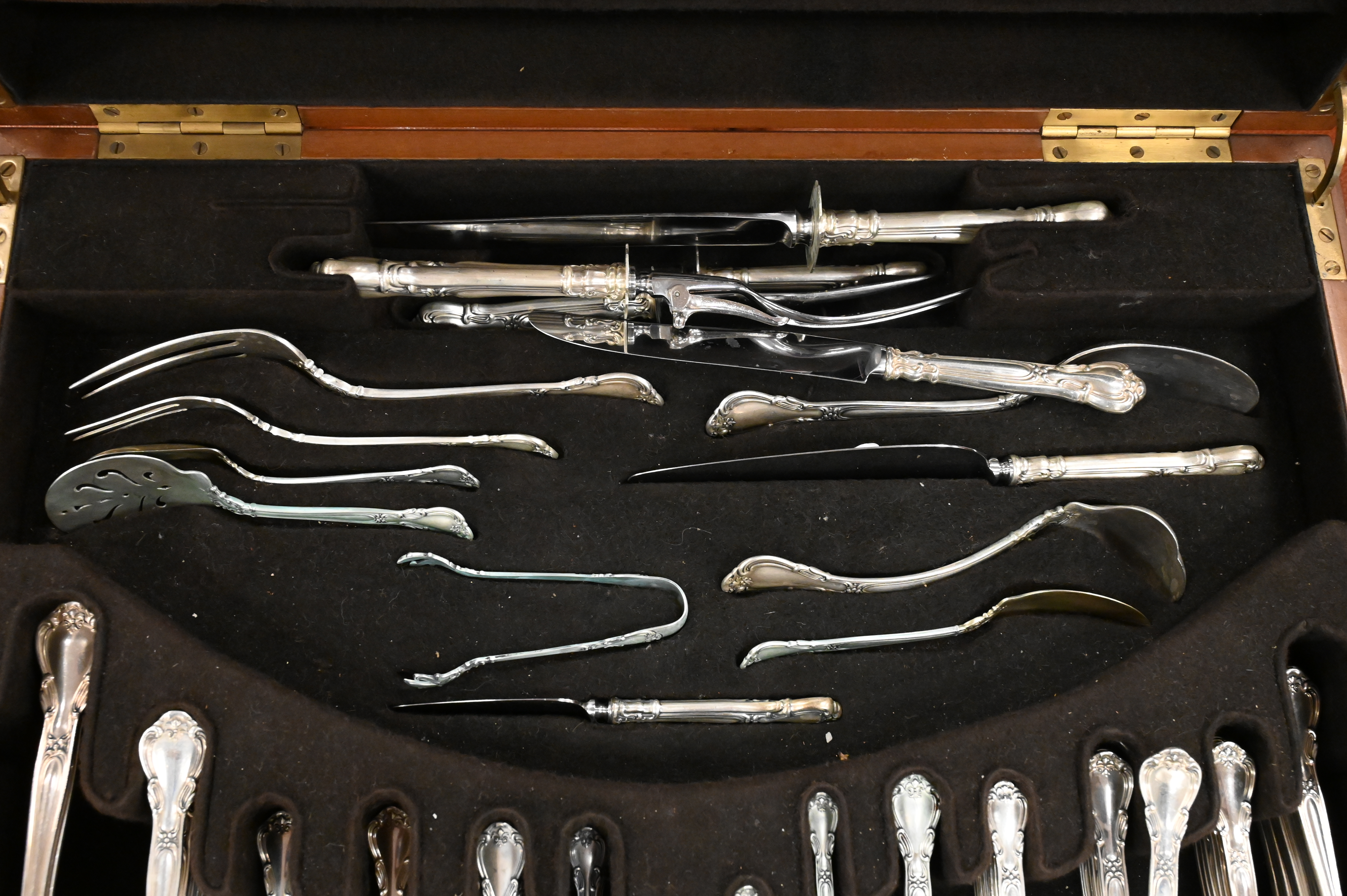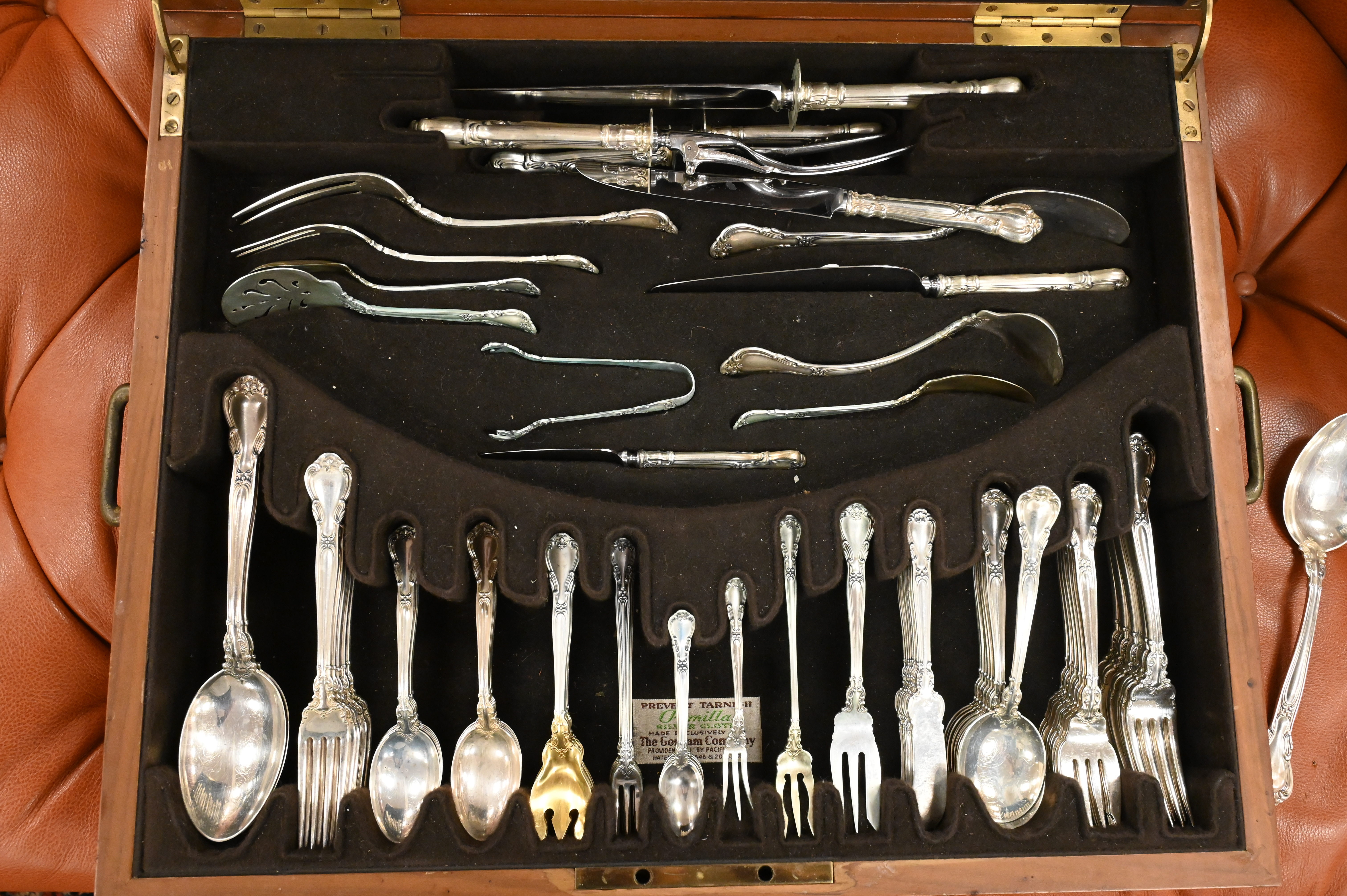 in custom fitted case, to include 10 dinner forks, 12 luncheon forks, 12 salad forks, 12 ice cream forks, one lemon fork, one cake/dessert fork, one olive/pickle fork, one large serving fork, one fish spoon, 12 cocktail forks, 11 soup spoons, 12 teaspoons, 12 demitasse spoons, one large serving spoon, three place spoons, one jelly spoon, one ladle, one tong, 12 dinner knives, 12 luncheon knives, 12 butter knives, one slotted server, one sugar spoon, one cheese server, one cake server, one steak carver, one steak fork, one roast carver, one roast fork, all marked for Gorham