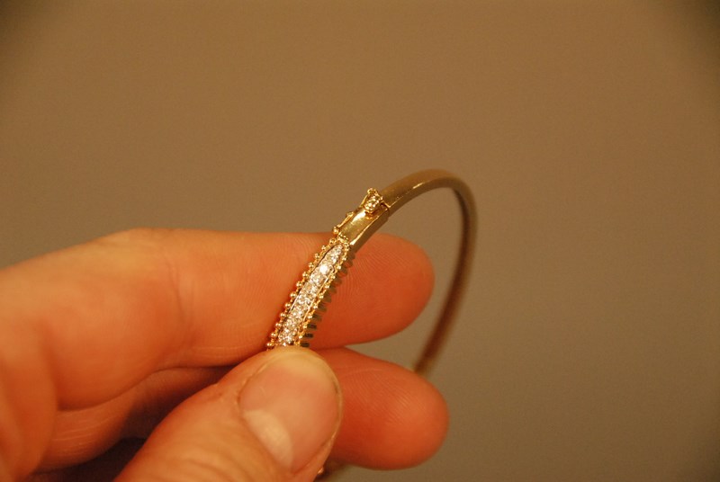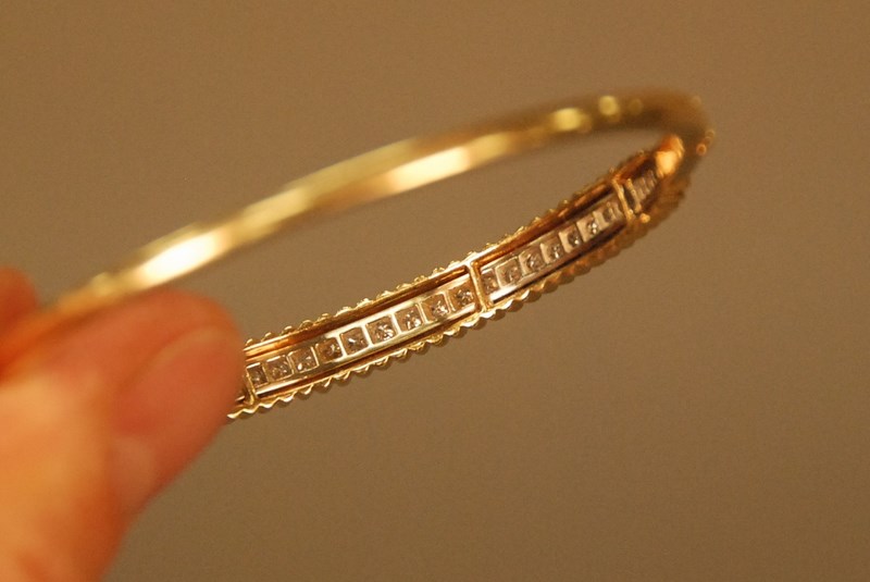 14K gold bangle style bracelet set with thirty three diamonds. 14.4 grams 2 1/4 x 2 oval