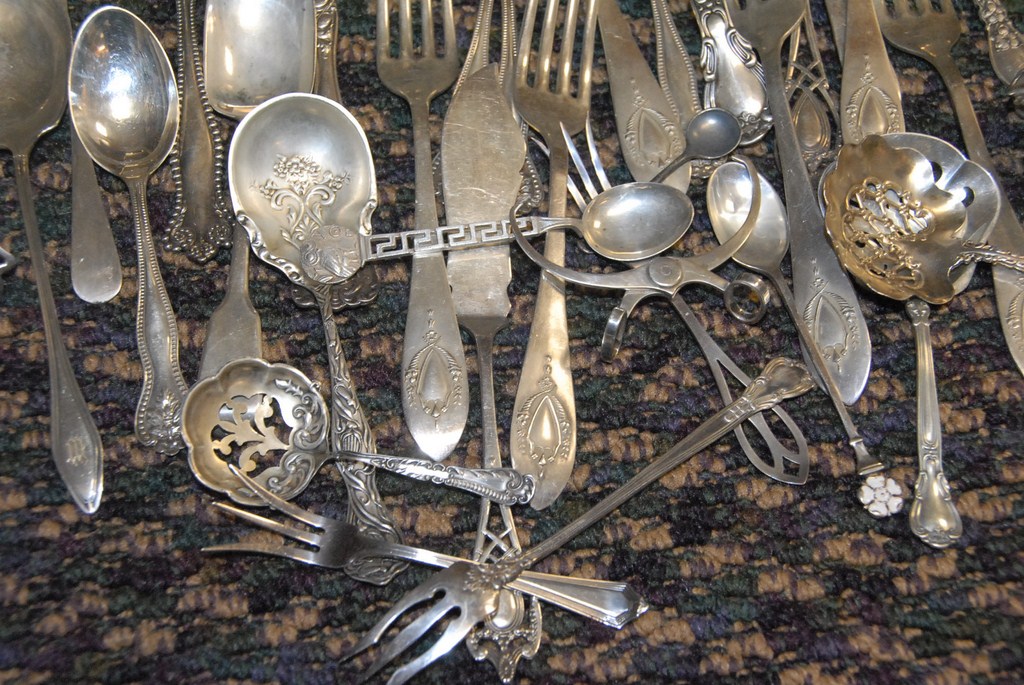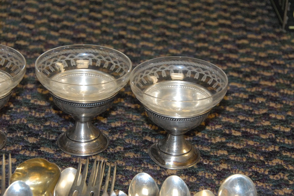 Box lot of sterling silver, forks, spoons, and small dishes and cover, 30.8 t oz.