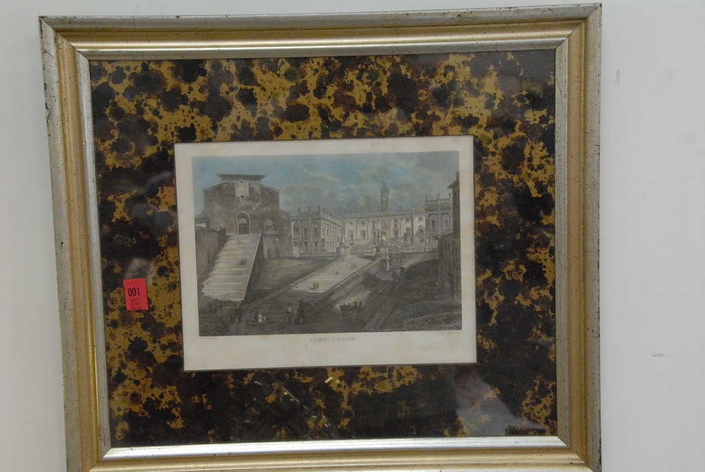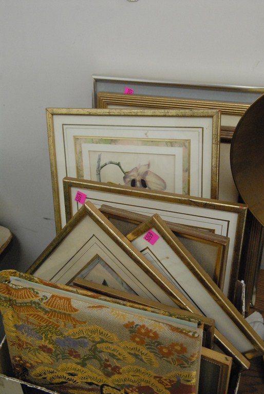 Lot 1: Group lot 20 prints and frames, carved teak book holder, carved teak painted mirror, brass lamps etc.