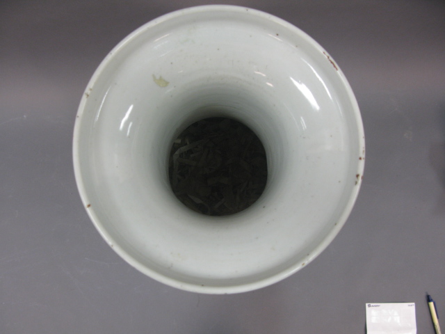 Large Oriental porcelain blue and white handled vase having overall scrolling vine decoration.