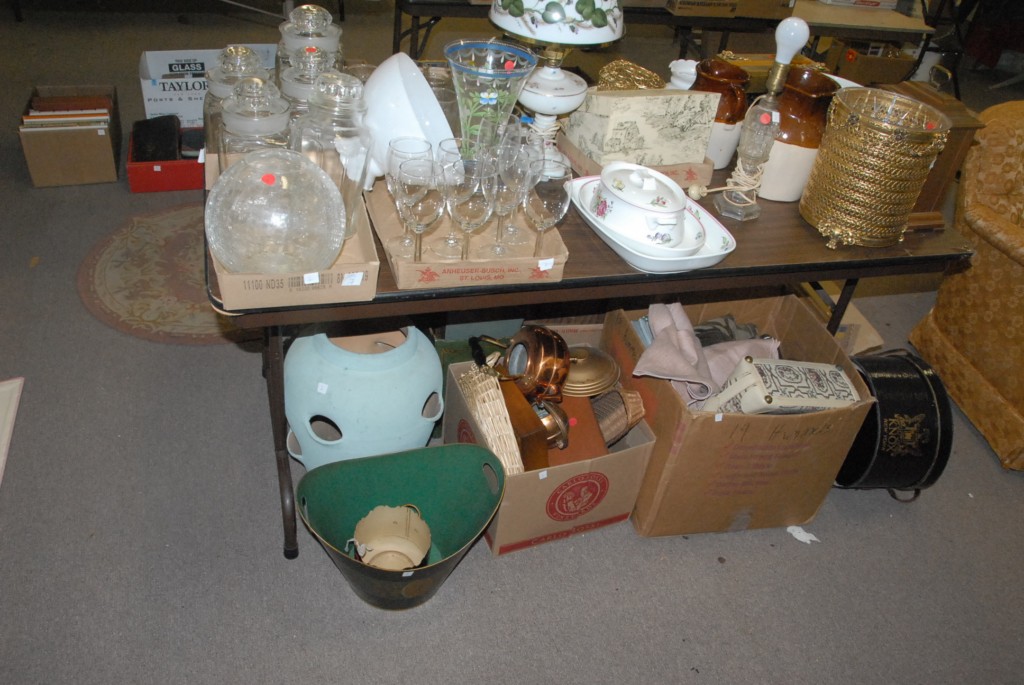 On top and below a table glass, china, stems, bowls, lamps, pictures, linen, vase, copper, tool baskets, foot stools, pots and pans, etc.