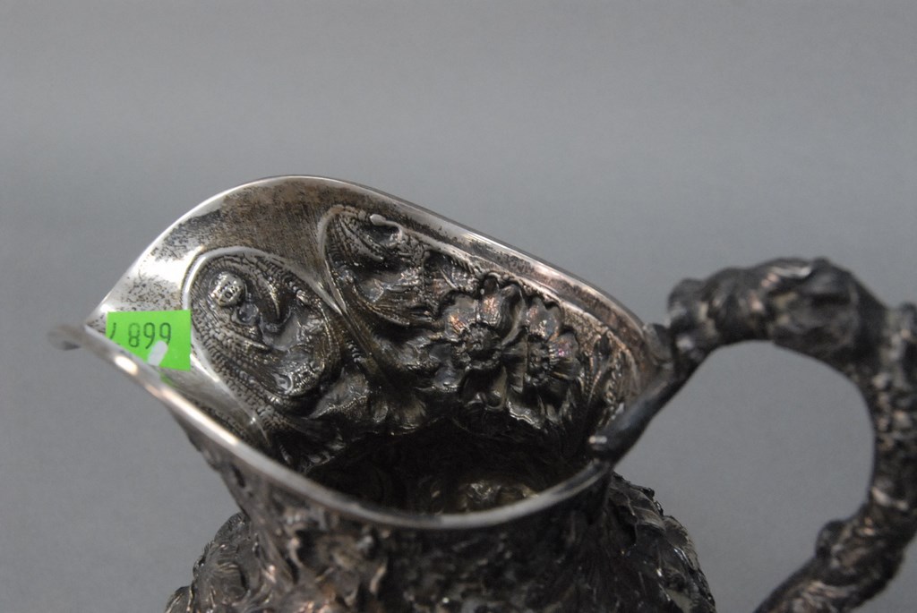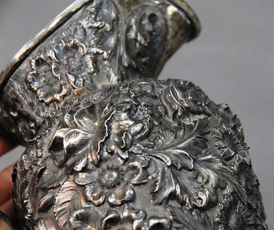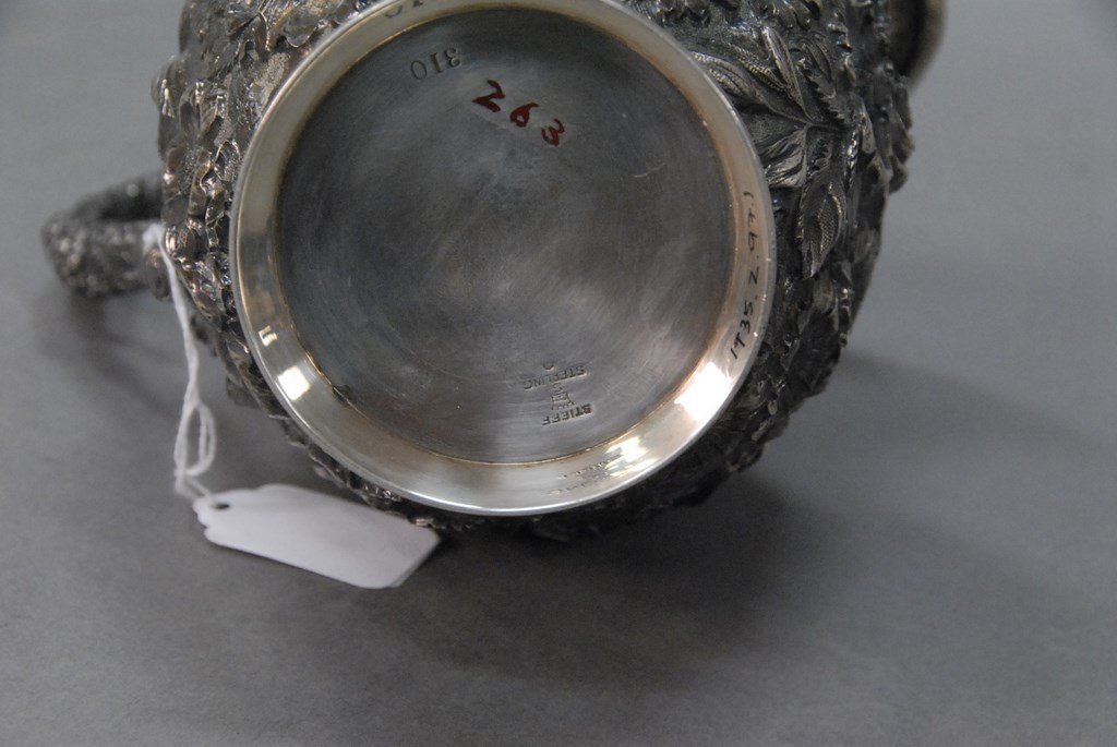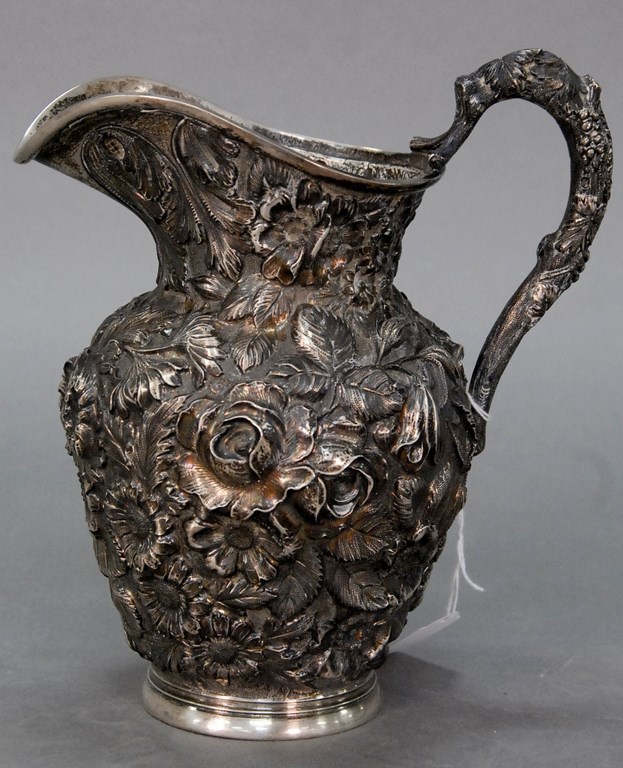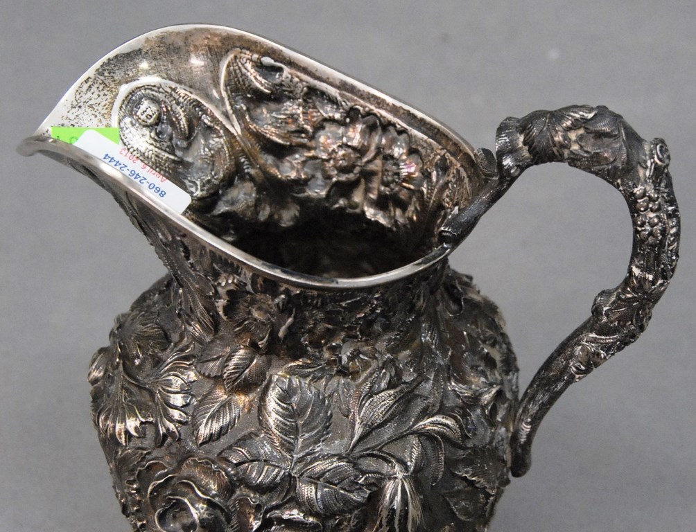 Lot 1: Stieff sterling silver pitcher, floral repousse with repousse handle. Provenance: Connecticut Historical Society 23.8 t oz.