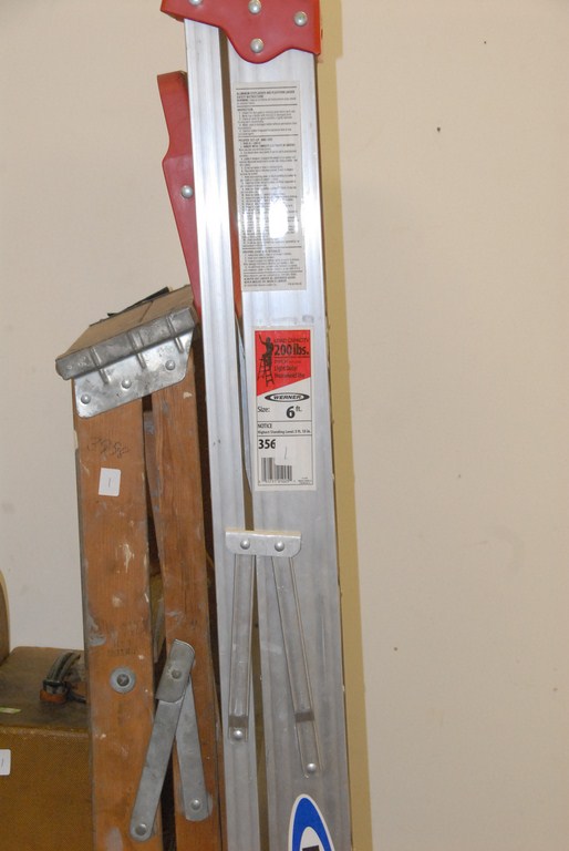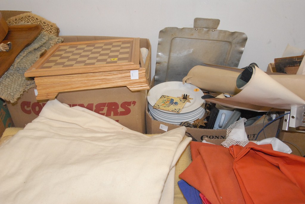 Lot 1: Table lot trays, baskets, kitchenware, dishes, prints, several framed prints, two step ladders and door mirror.