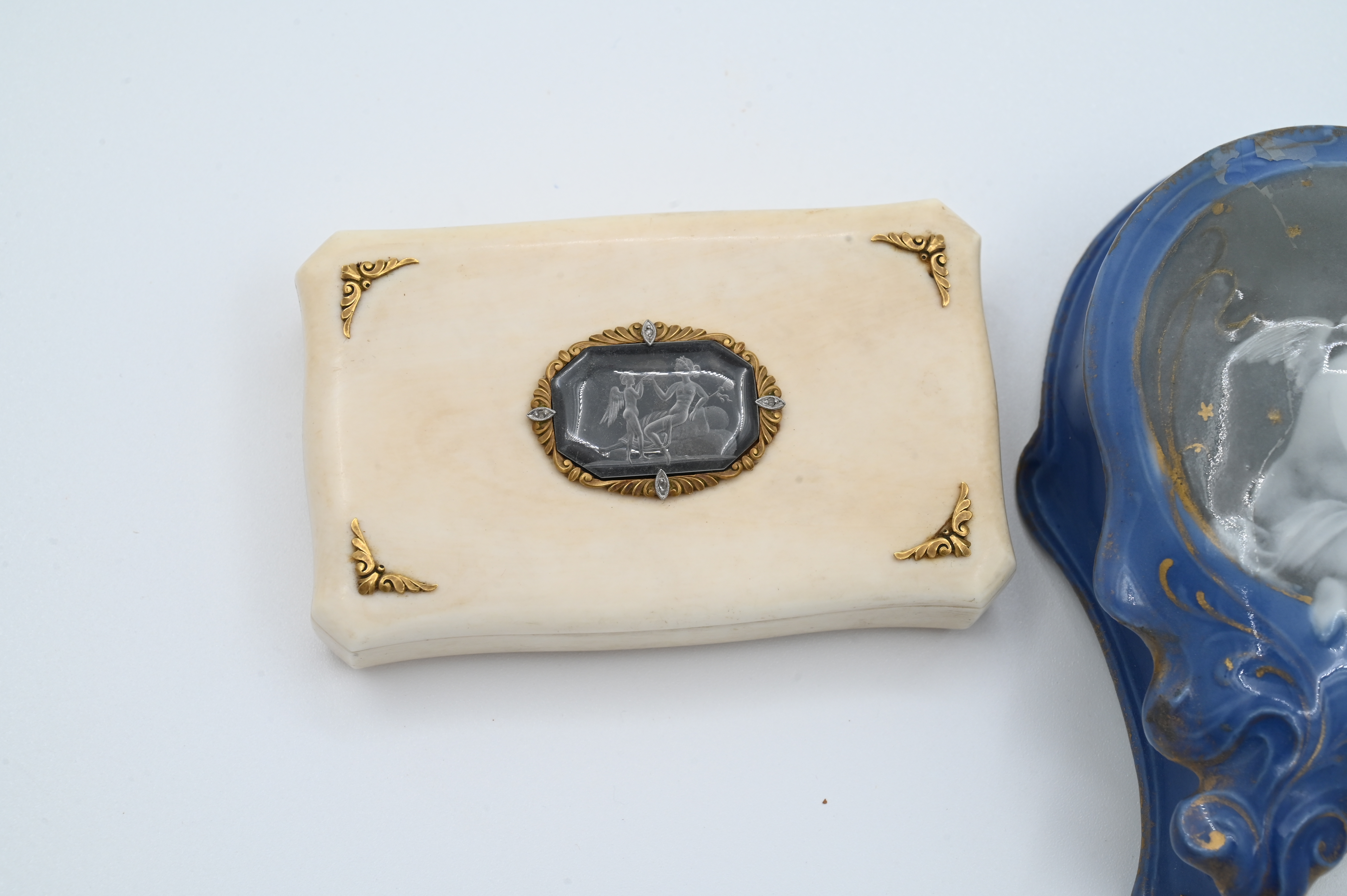 one pate-sur-pate, one 19th century having gold mounts, one shagreen with wedgwood style plaque