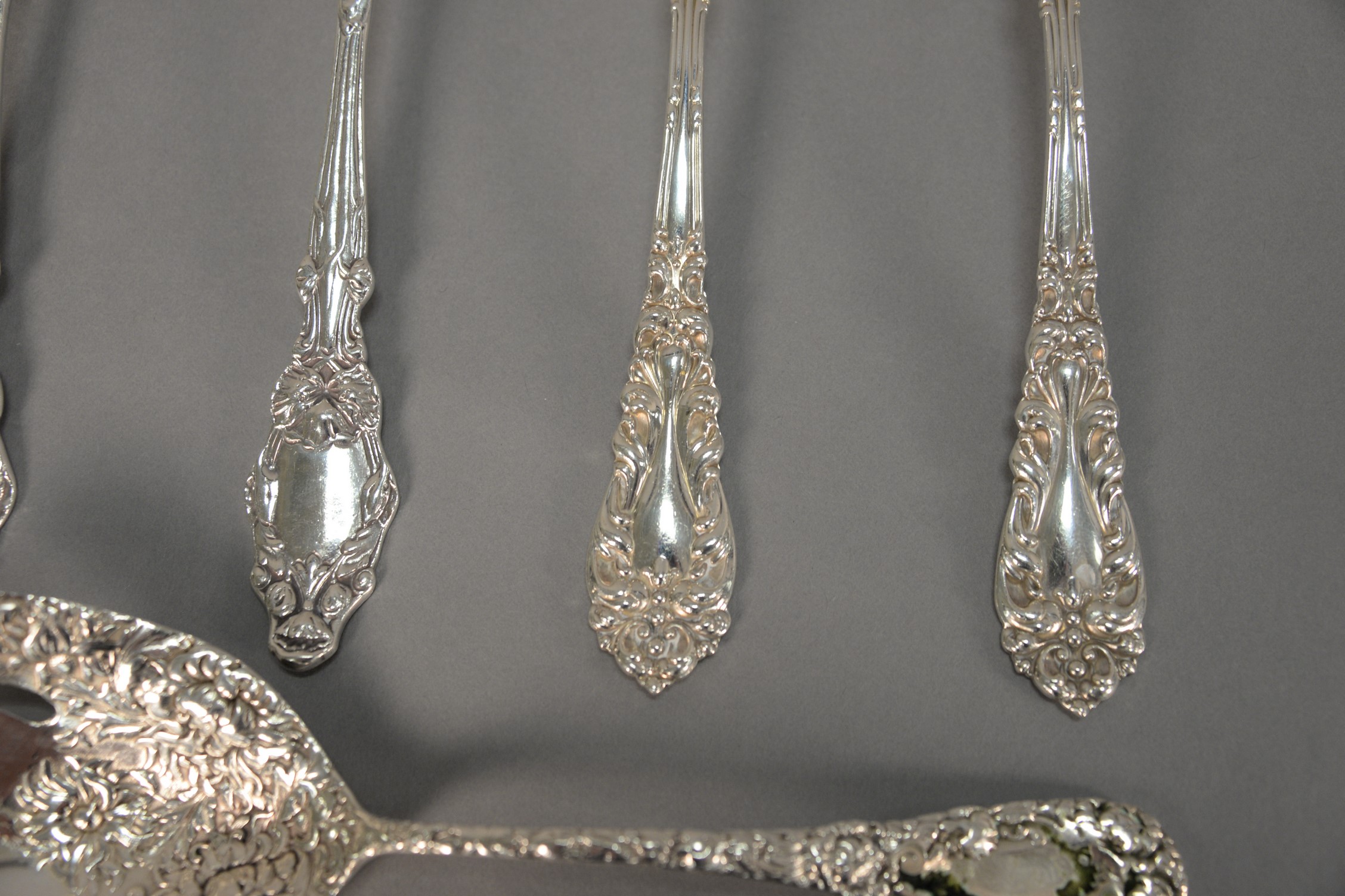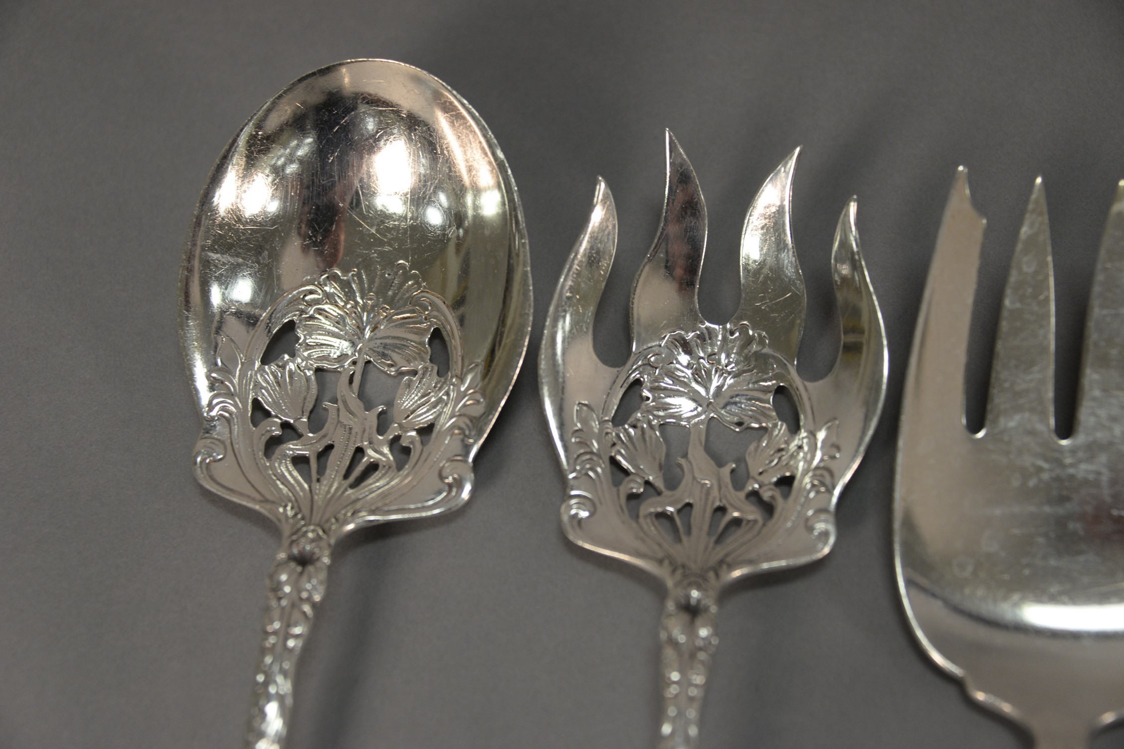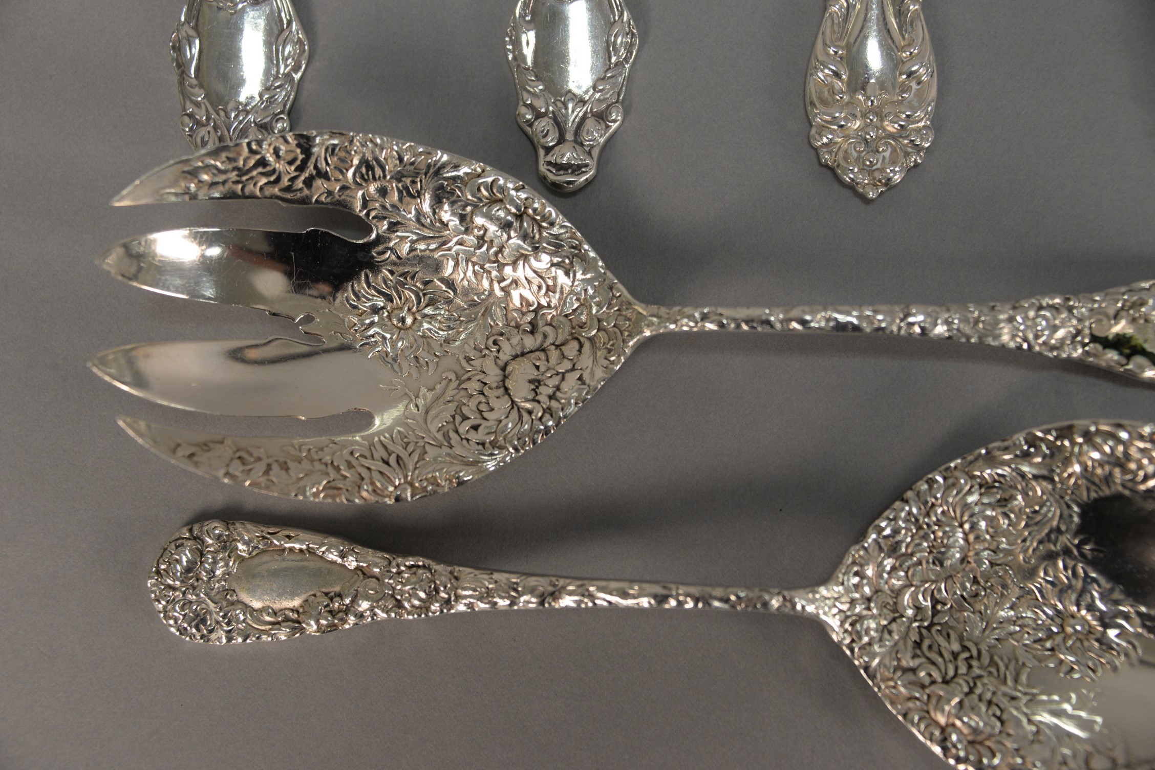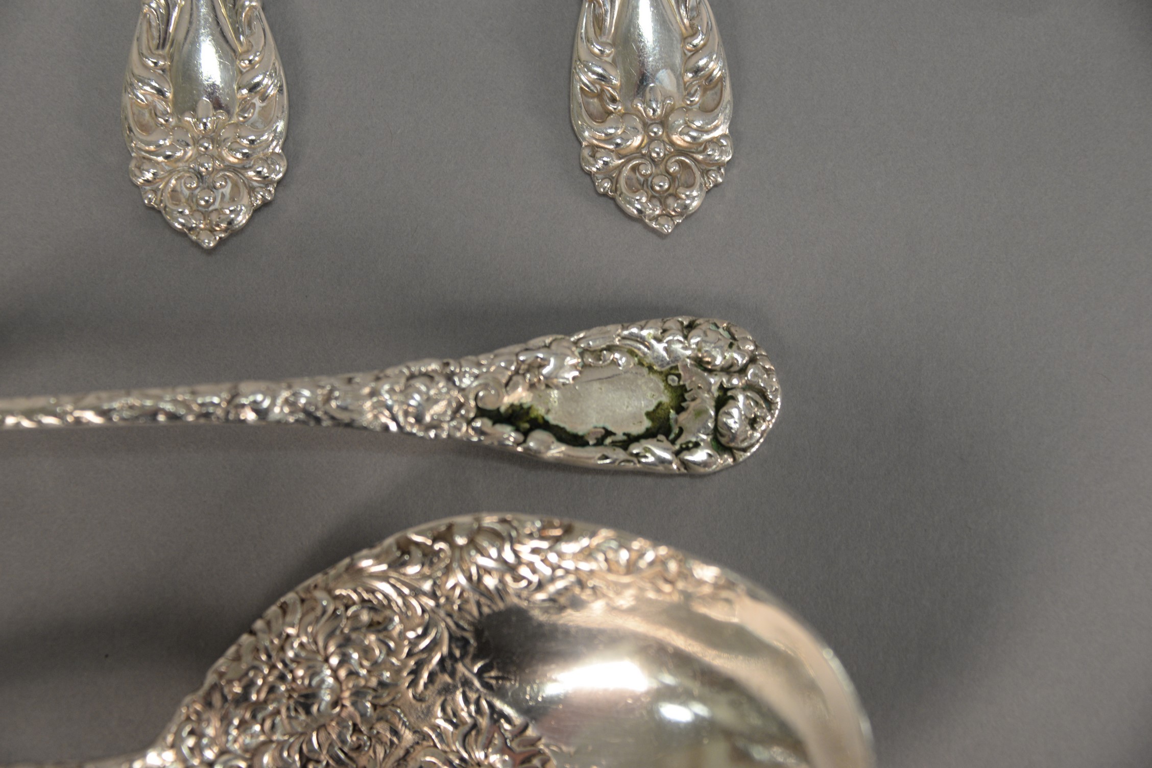 Lot 1: Three pairs of sterling silver serving pieces including Silvercraft repousse fork and spoon, Amston fork and spoon, and an unmarked…