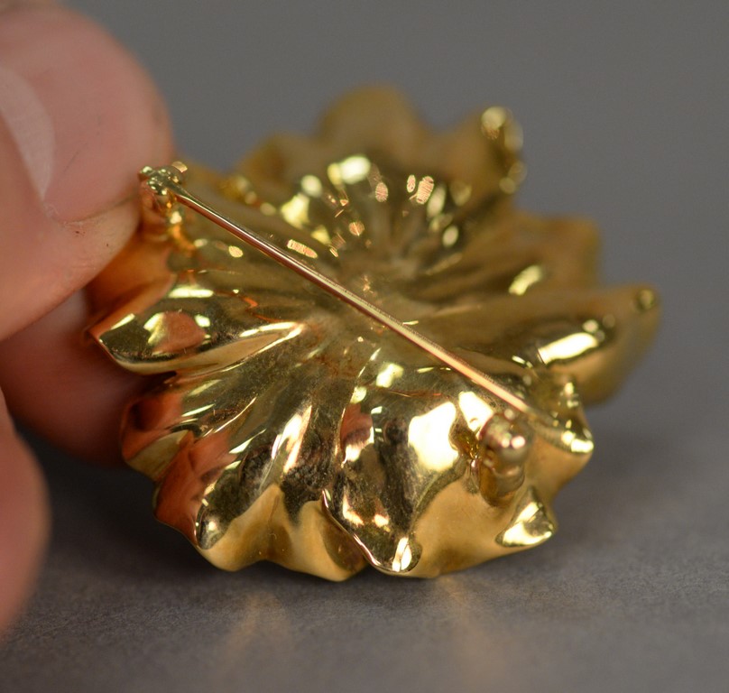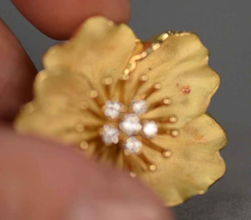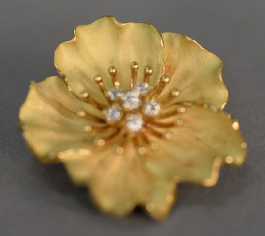 Lot 1: Tiffany 18K gold flower brooch set with six diamonds and enameled petals. 26.4 grams dia. 1 1/2 in.