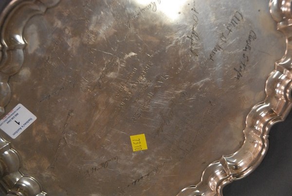 Lot 1: Tiffany & Co. sterling silver tray, monogrammed Max Tishler, Director, Merck Co., Inc. 1962-1970 with several signatures, 36.8 t o…