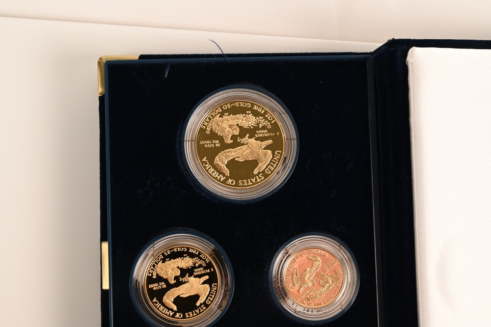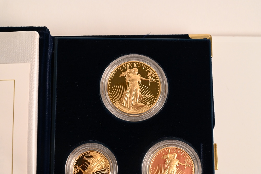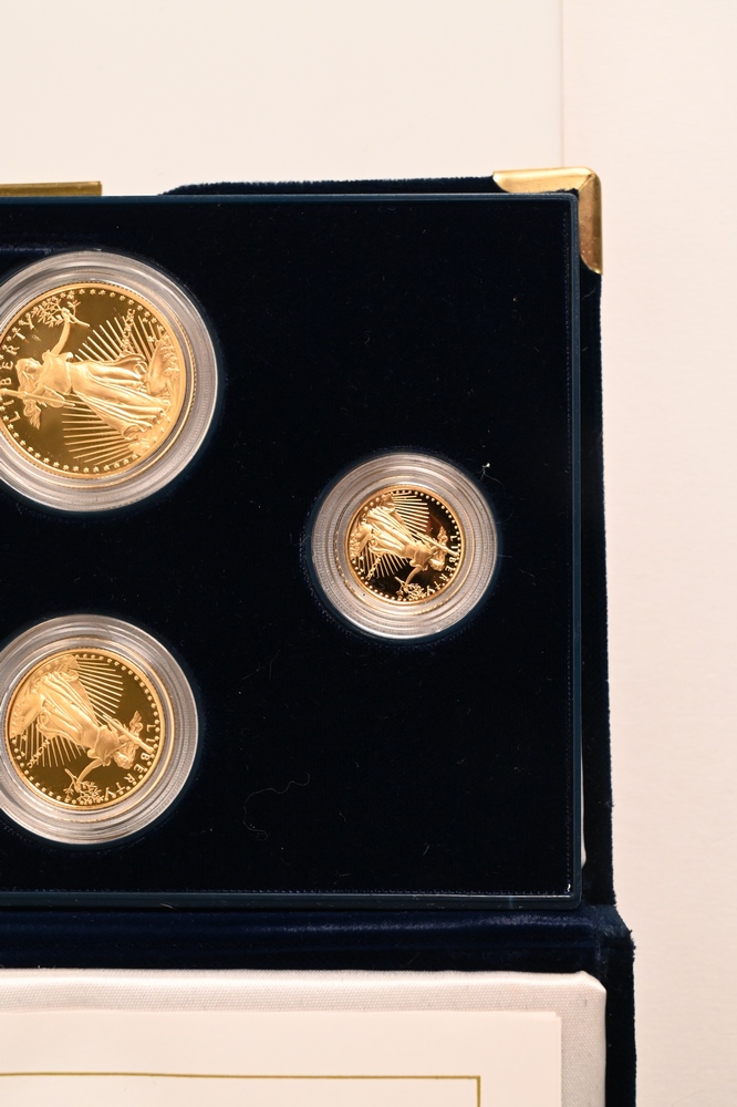 Lot 1: United States Mint American Eagles Gold Proof Set, consisting of 4 – 1990 coins, 1 oz. fine gold 50 dollar, 1/2 oz. 25 dollar, 1/4 oz. 10 dollar, 1/10 oz. 5 dollar.