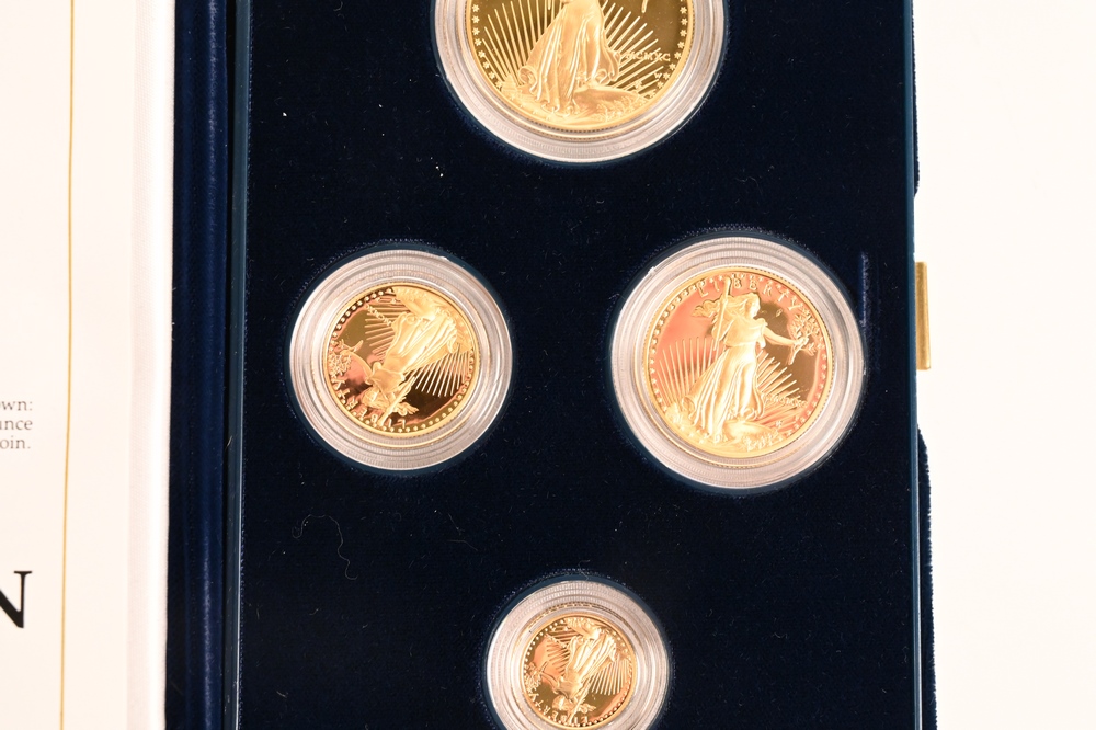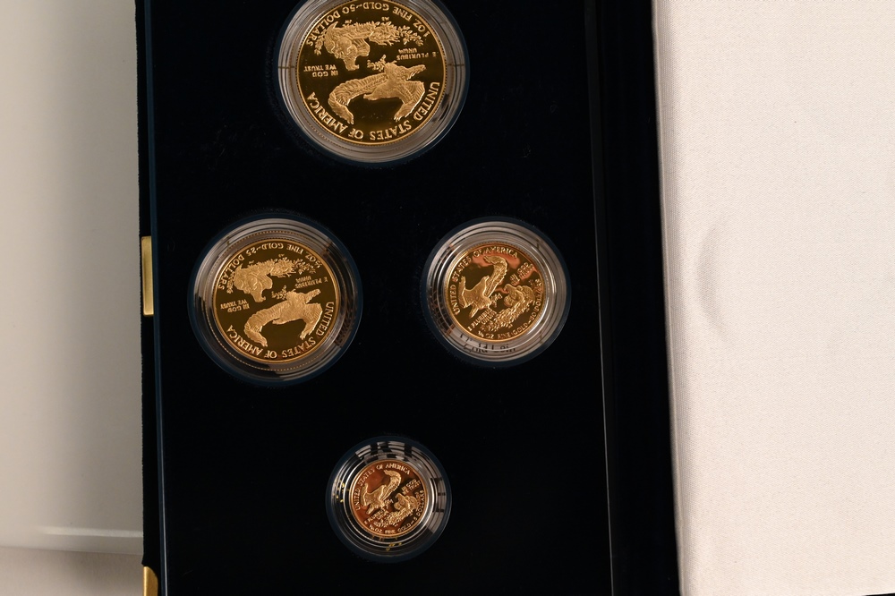 United States Mint American Eagles Gold Proof Set, consisting of 4 – 1990 coins, 1 oz. fine gold 50 dollar, 1/2 oz. 25 dollar, 1/4 oz. 10 dollar, 1/10 oz. 5 dollar.