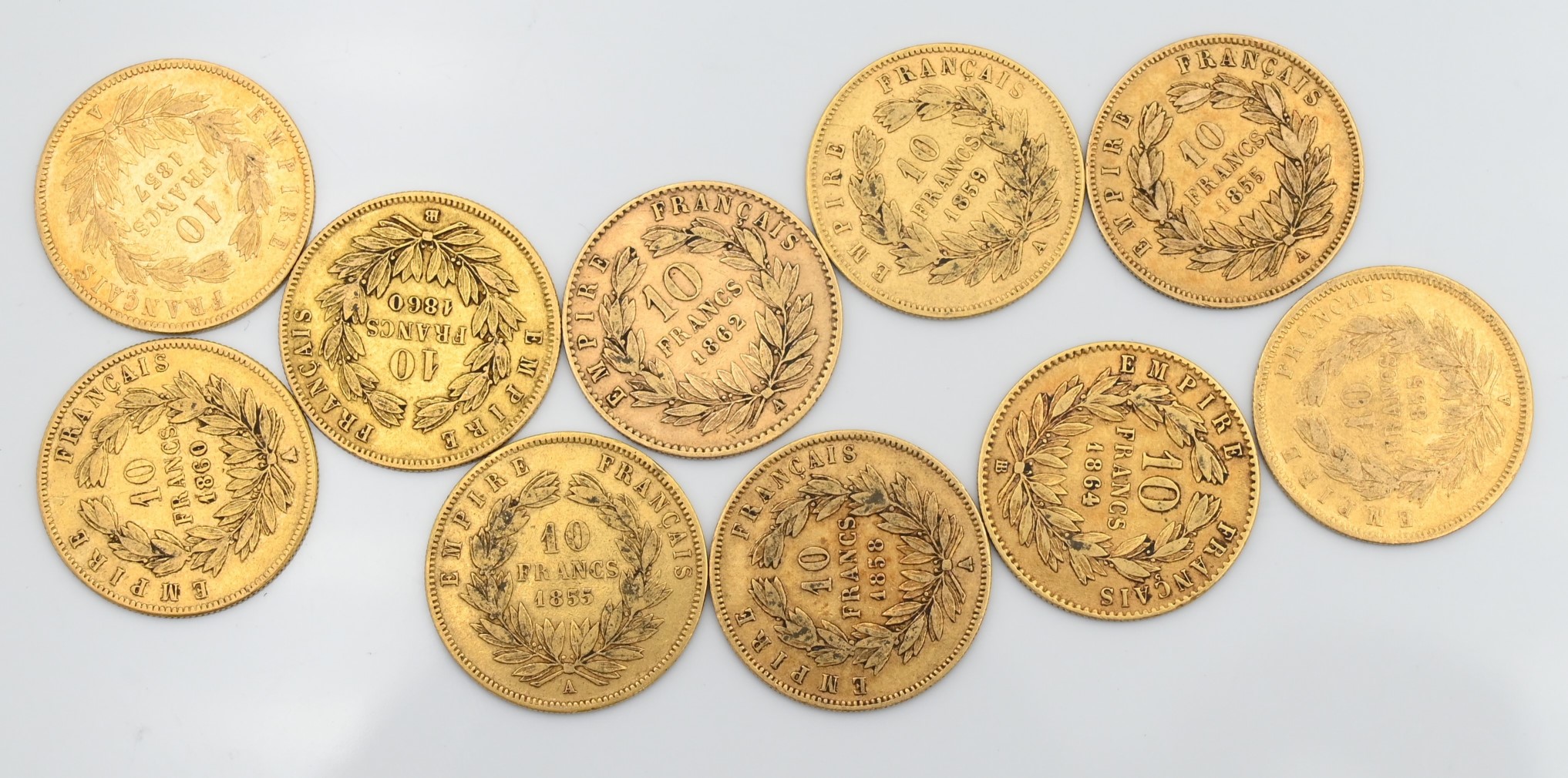 10 Napoleon III Gold Coins, 10 Francs each, circulated, 31.8 gr.