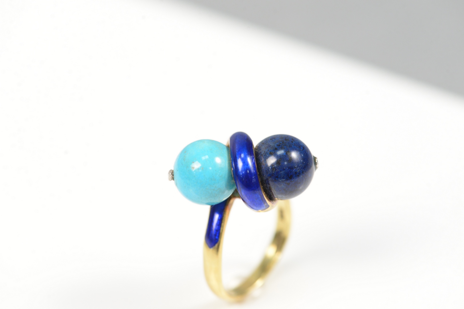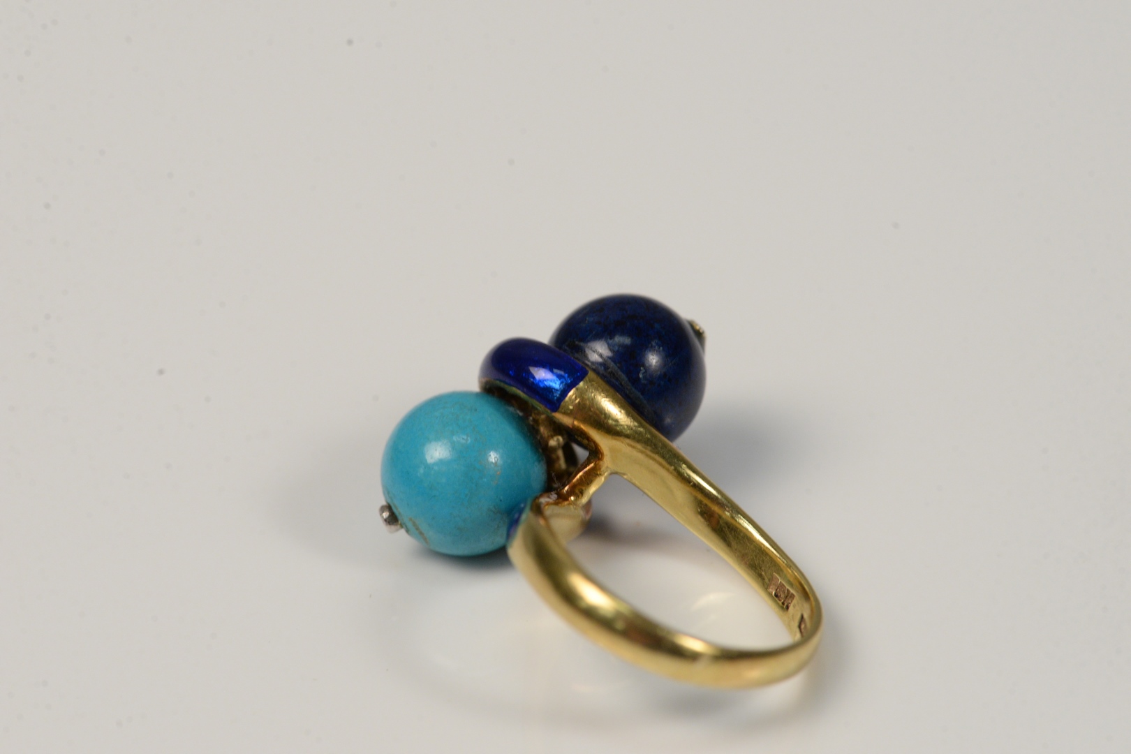 Lot 10: 18 Karat Gold Ring set with blue turquoise and blue lapis beads surrounded by blue enamel size 6 1/2