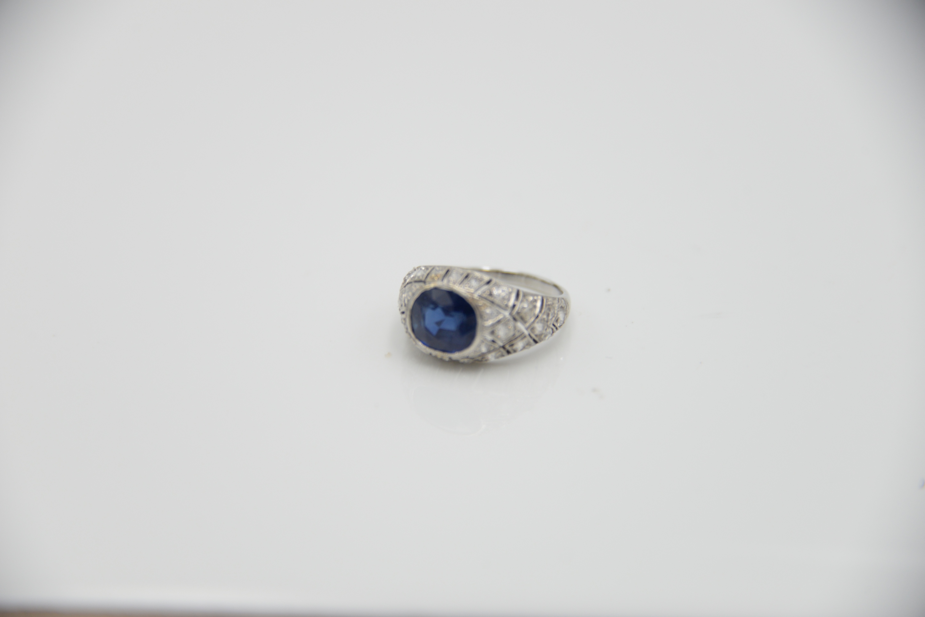 18 Karat White Gold Ring set with center oval blue sapphire set with basket woven design with diamonds size 4 3/4, 4.2 grams.