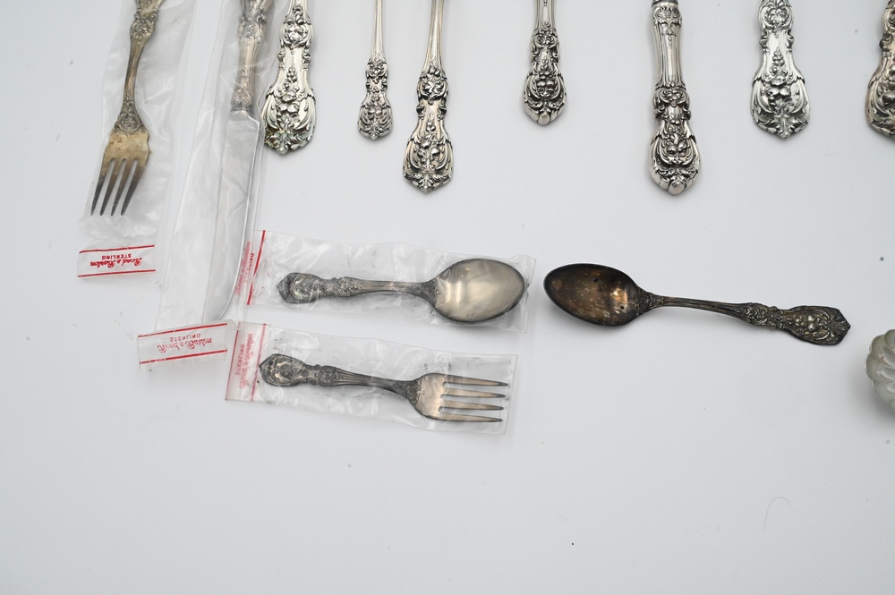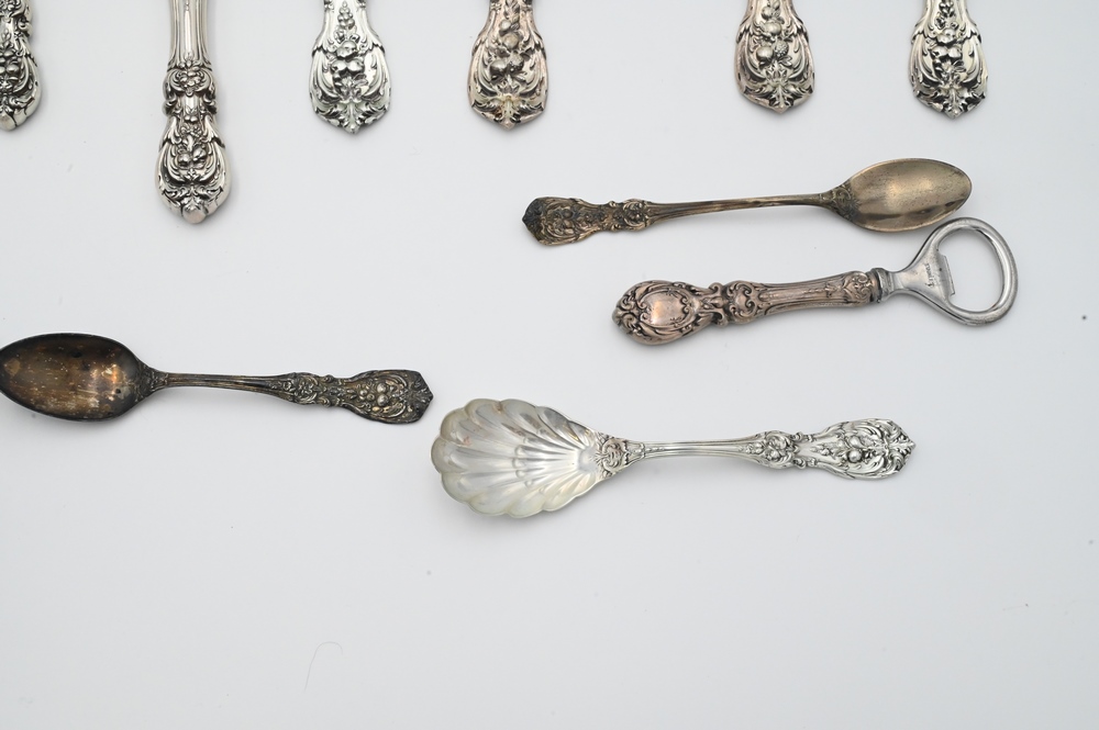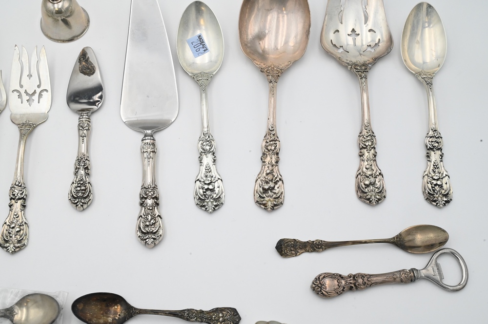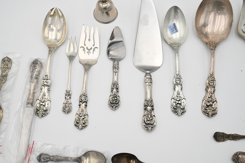 Lot 10: 18 Piece Reed and Barton Francis I Sterling Silver Serving Set, along with a two piece baby set in original box, 26.4 t.oz. plus 5 handles and bell.