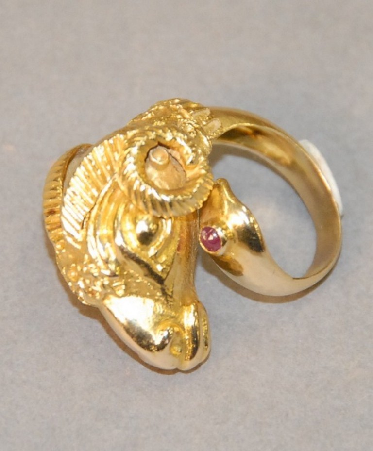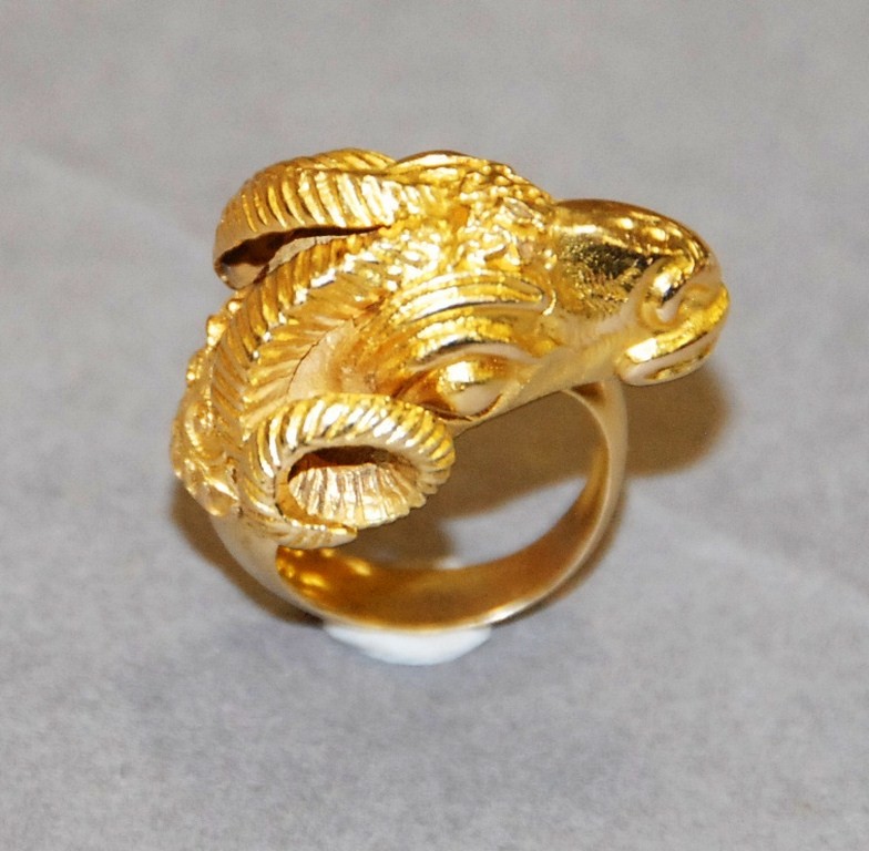 Lot 10: 18kt gold ring with large rams head. size 6 1/2