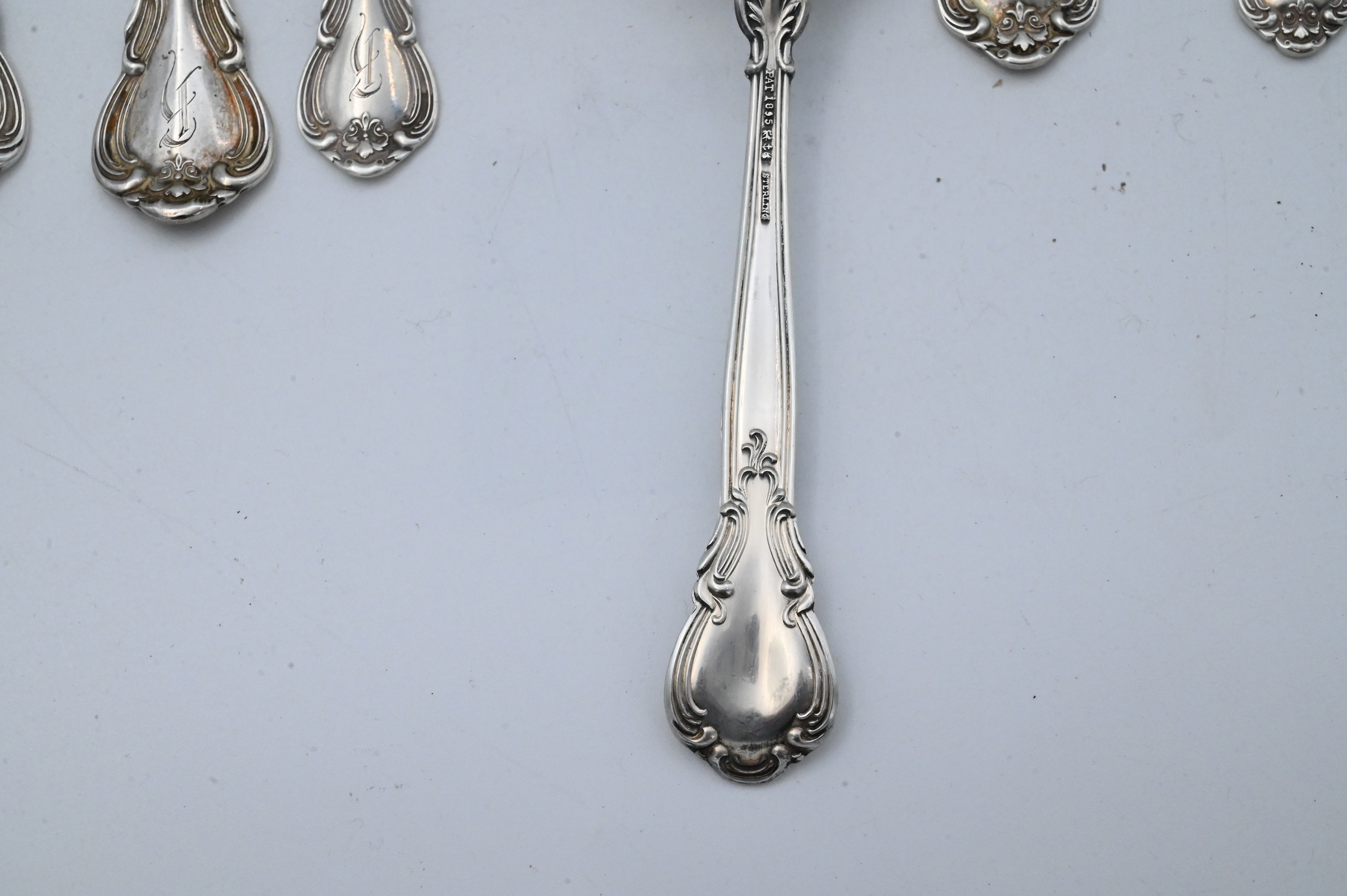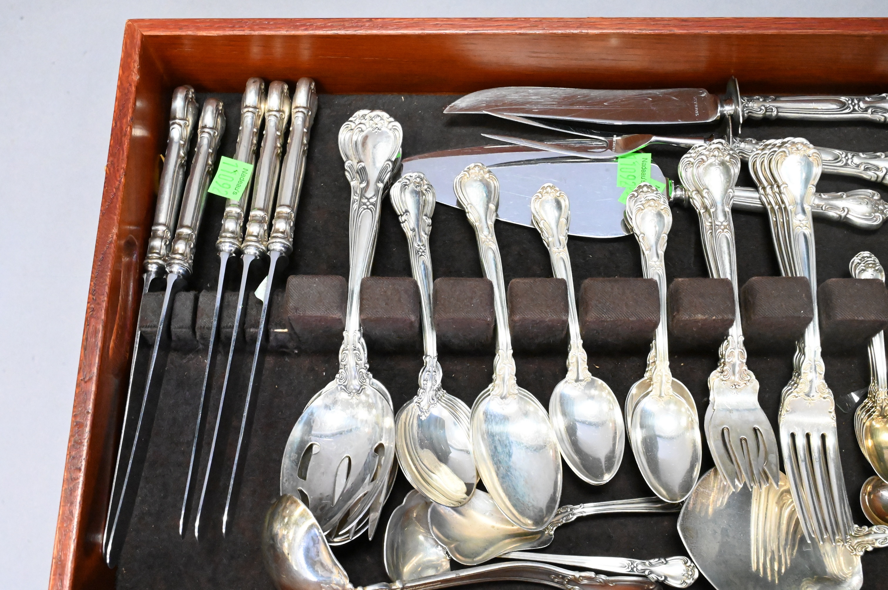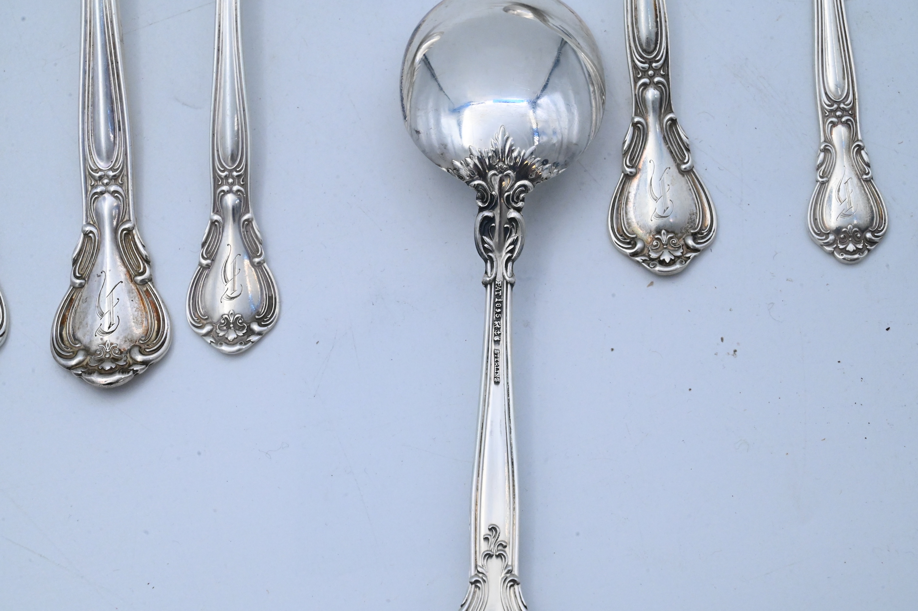 to include six dinner forks, six salad / fish forks, six tablespoons, eight soup spoons, 12 tea spoons, six demi spoons, three place spoons, one slotted serving spoon spoon, one large serving fork, six dinner knives, six butter knives, two ladles, one tong, one sugar spoon, one salt spoon, one server, three serving pieces