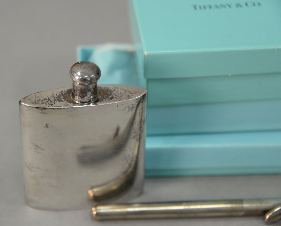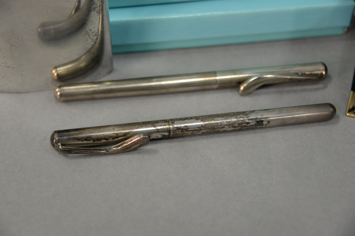 Lot 10: Five piece silver lot including two Tiffany silver pens marked Peretti in original bags and boxes, a small silver flask, a silver pe…