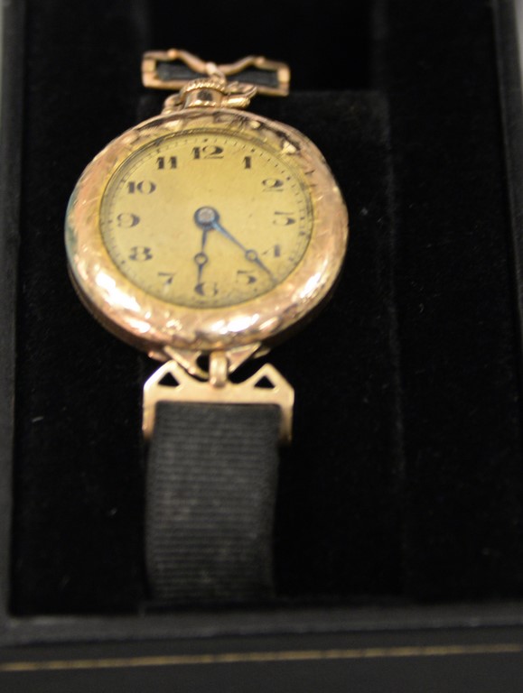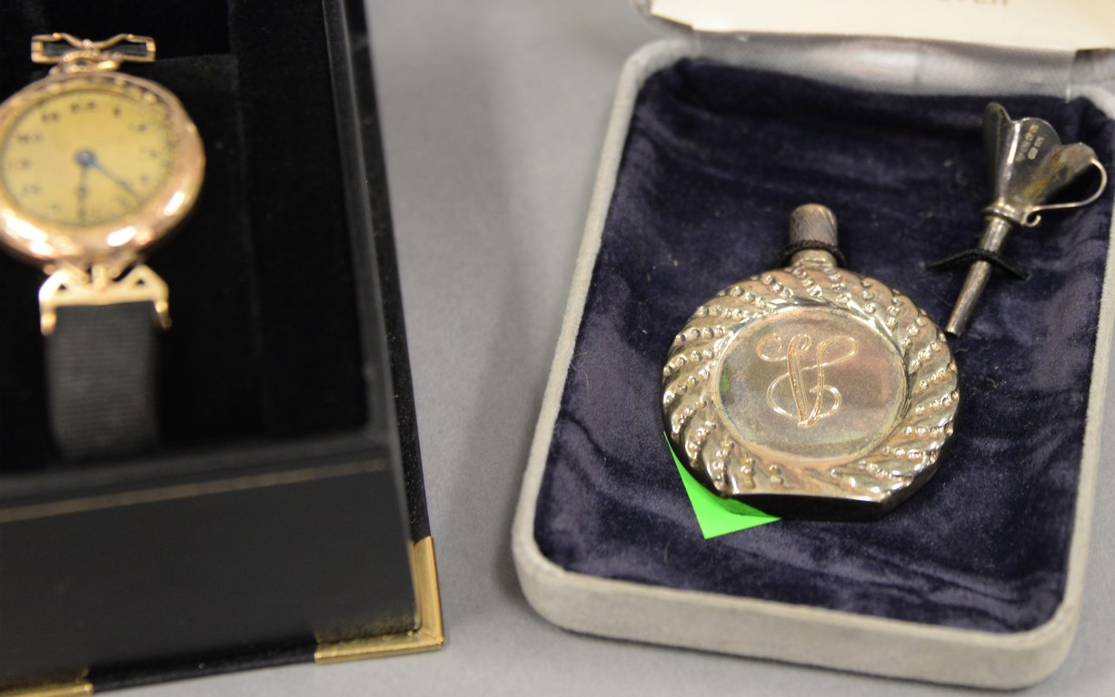 Five piece silver lot including two Tiffany silver pens marked Peretti in original bags and boxes, a small silver flask, a silver perfume with funnel, and a womans wristwatch with ribbon bracelet.