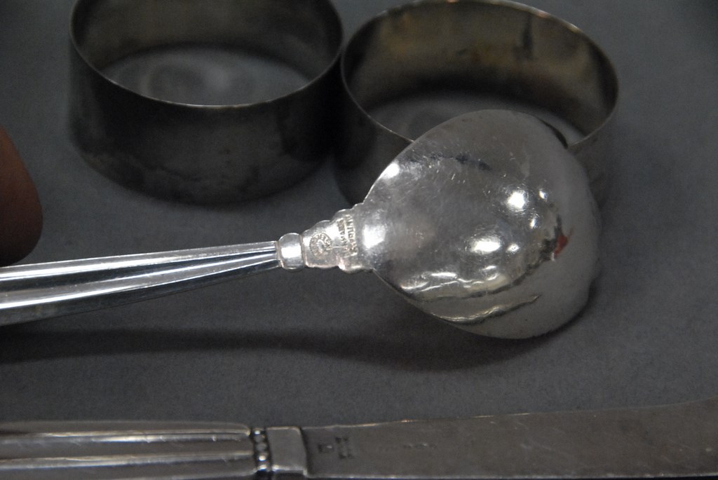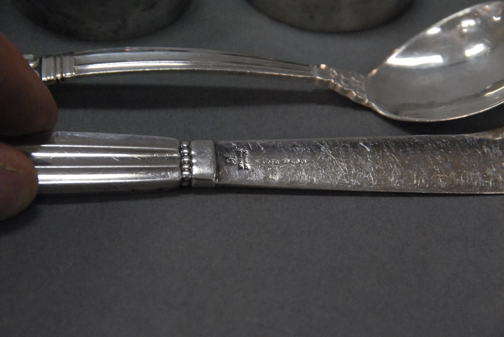 Lot 10: George Jensen butter knife and small spoon along with two sterling silver napkin holders. 3.1 t oz.